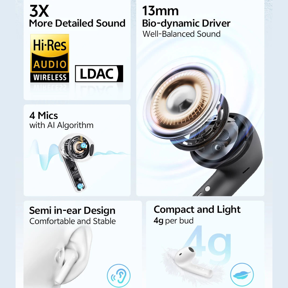 درایورهای بزرگ ۱۳ میلیمتری، پشتیبانی از کدک LDAC و Hi-Res Audio و بلوتوث 5.4، این مدل را برای گوش دادن طولانیمدت به موسیقی، ویدیو و حتی گیمینگ سبک، خیلی جذاب کرده است.