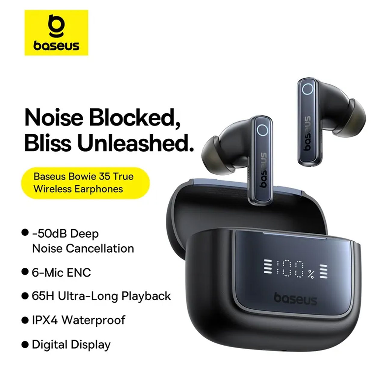 هندزفری بلوتوثی 5.3 نویزکنسلینگ بیسوس Bowie 35 با ANC تا 50dB، ۶ میکروفون ENC، باتری تا ۸ ساعت (۶۵ ساعت با کیس)، استاندارد IPX4 و نمایشگر دیجیتال؛ مناسب موسیقی، مکالمه و استفاده روزمره.