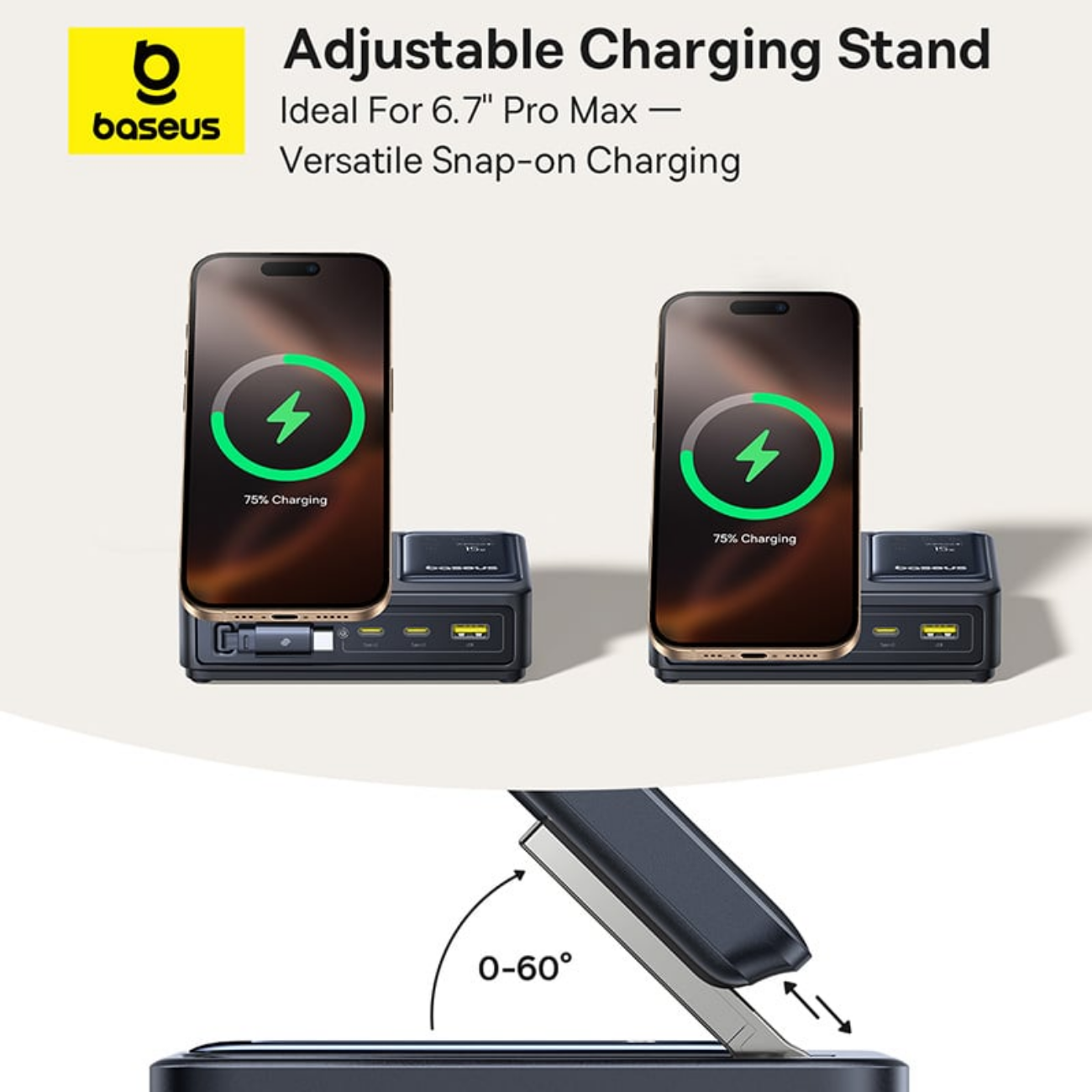 جواب: این مدل یک پد وایرلس مگنتی ۱۵ وات، یک کابل تایپسی جمعشونده، دو پورت Type-C و یک USB-A دارد و در مجموع میتواند تا ۵ دستگاه را همزمان شارژ کند.