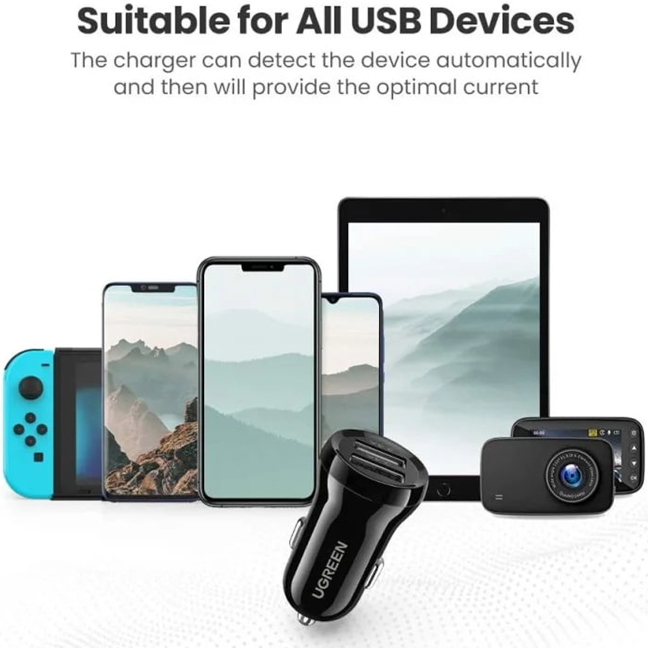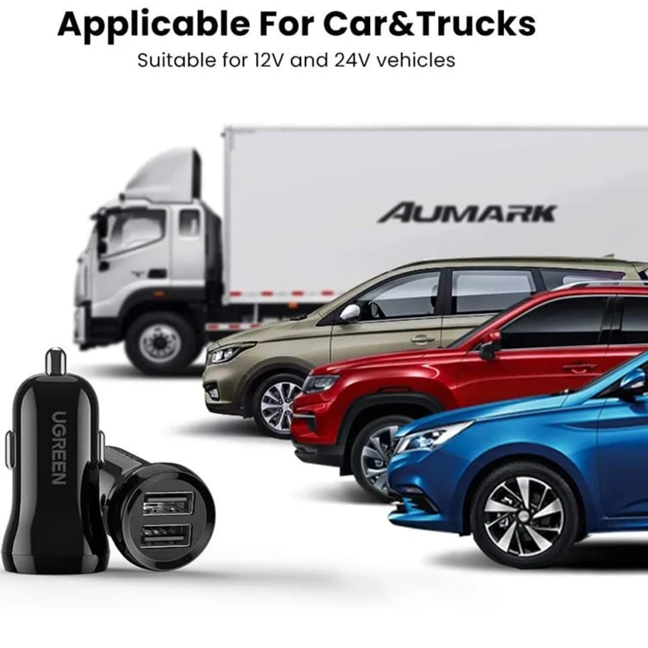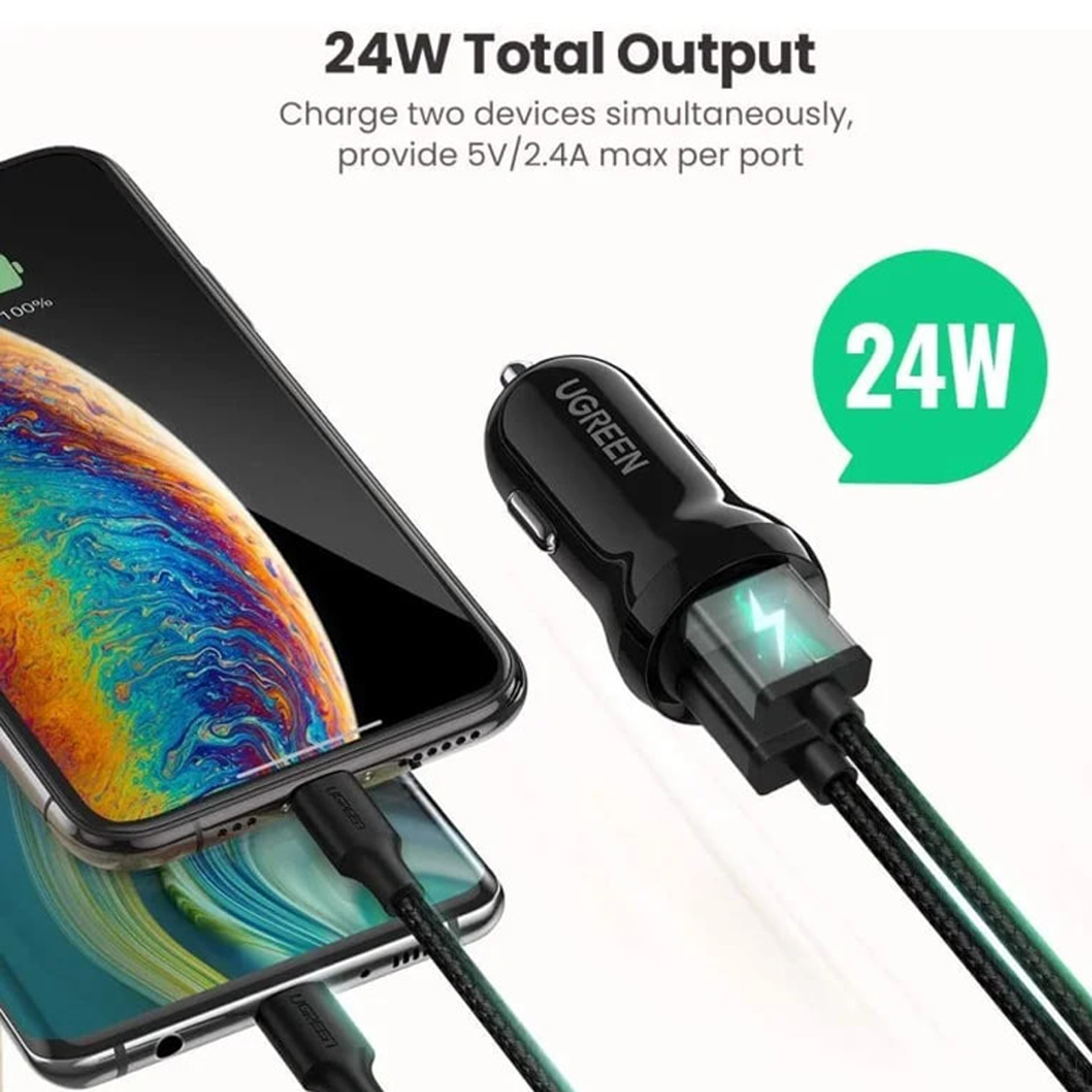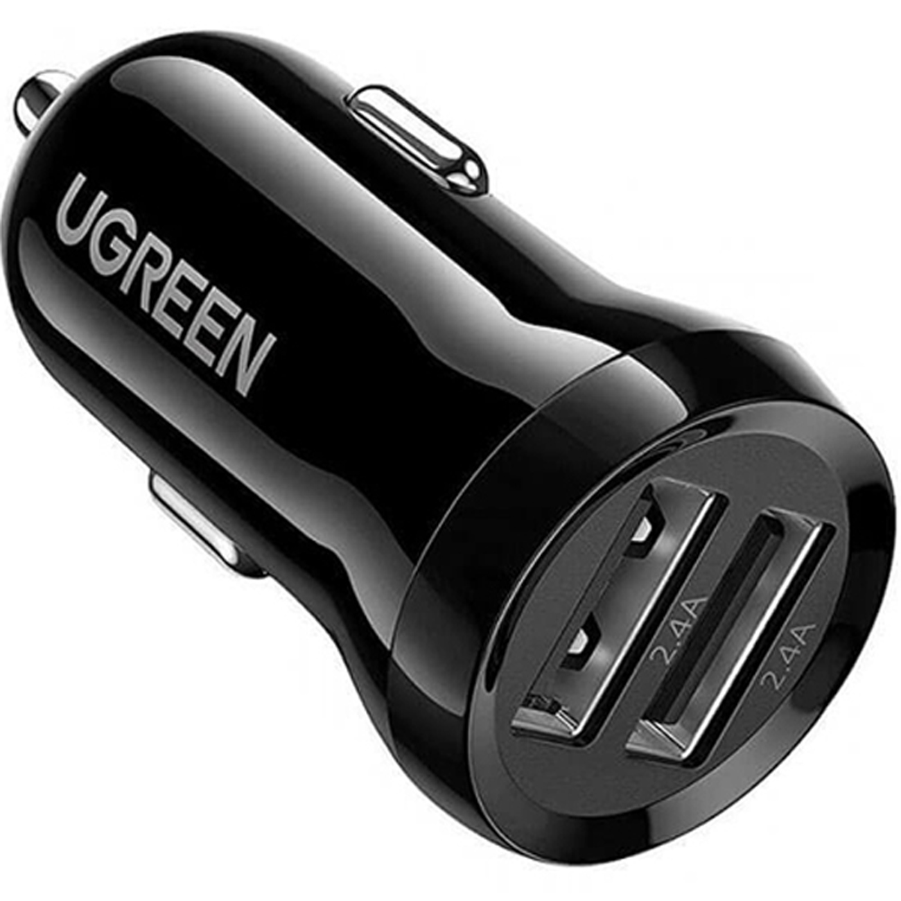 شارژر فندکی دوپورت یوگرین UGREEN ED018 کد 50875 با توان خروجی ۲۴ وات، ورودی ۱۲-۲۴ ولت، دو خروجی USB-A 5V/2.4A، بدنه کوچک و مقاوم، مناسب شارژ همزمان دو دستگاه در خودرو.