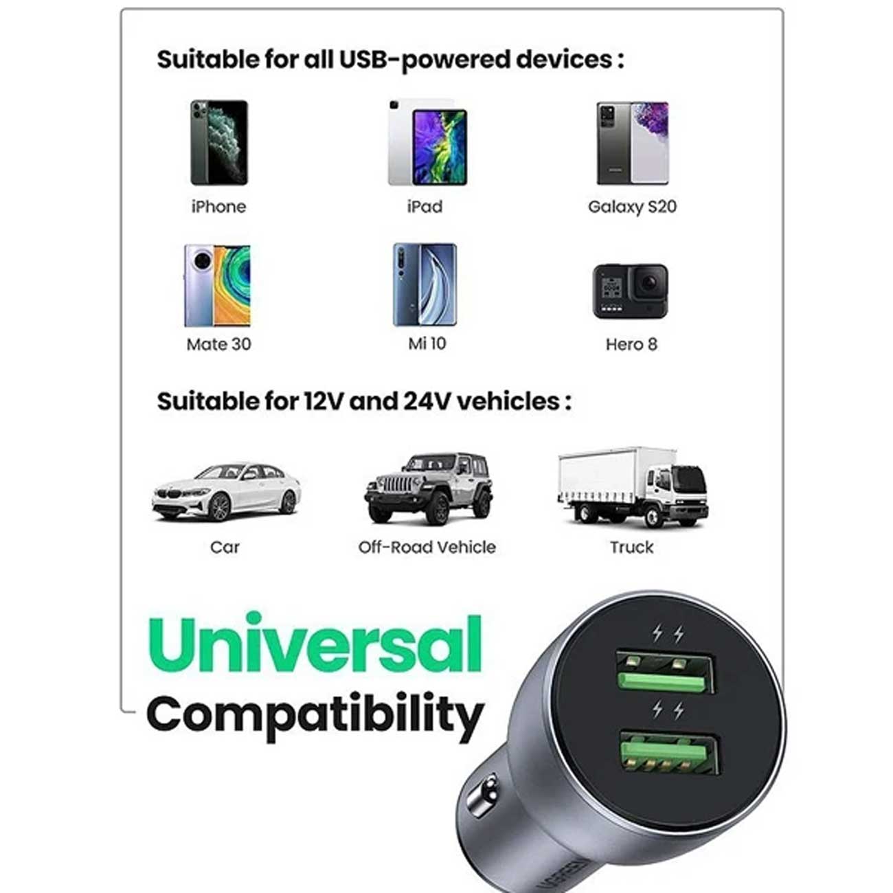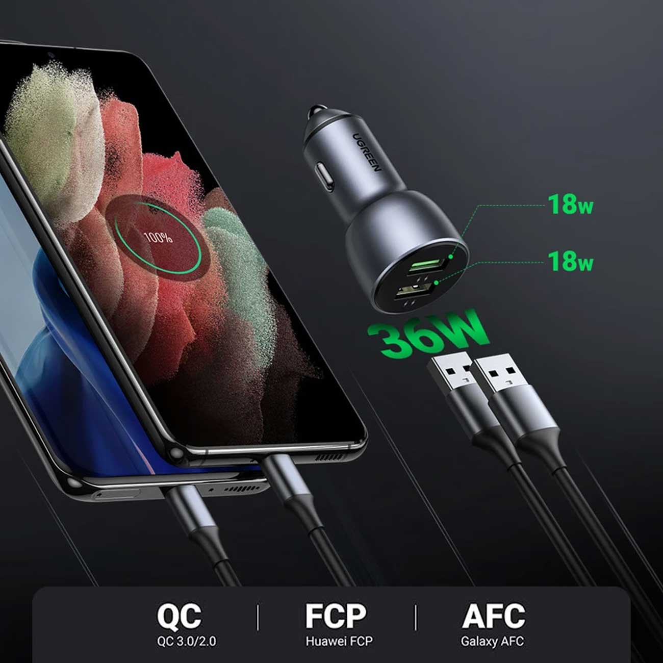 شارژر فندکی فست شارژ ماشین 36 وات یوگرین Ugreen CD213 10144 یک انتخاب حرفهای و بلندمدته برای دستهی لوازم خودروی گجتجان.