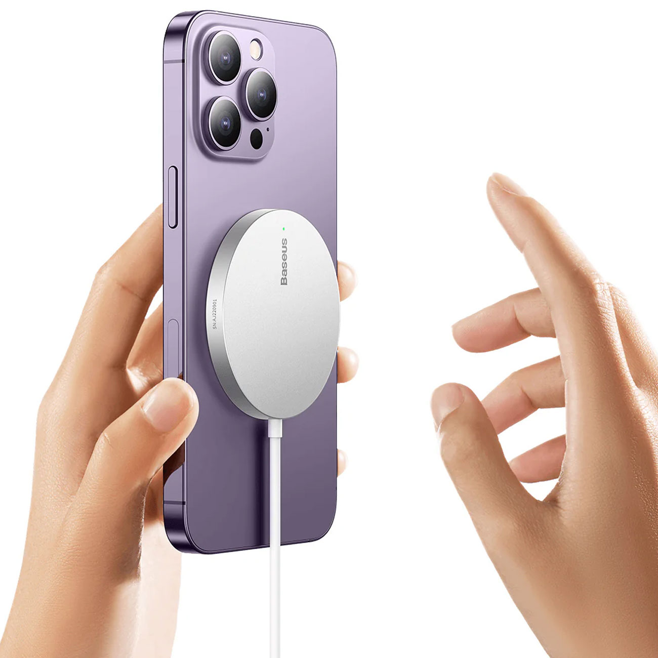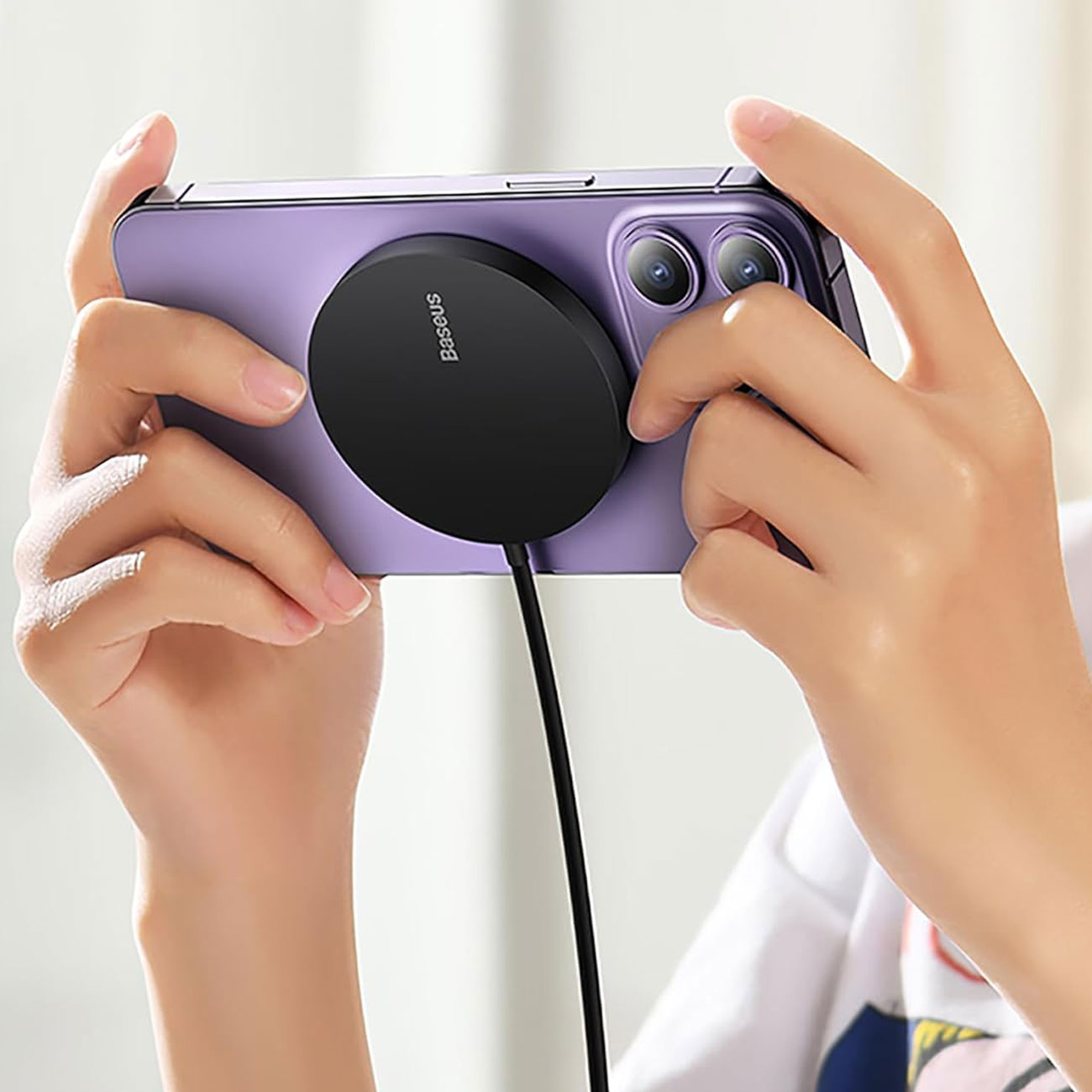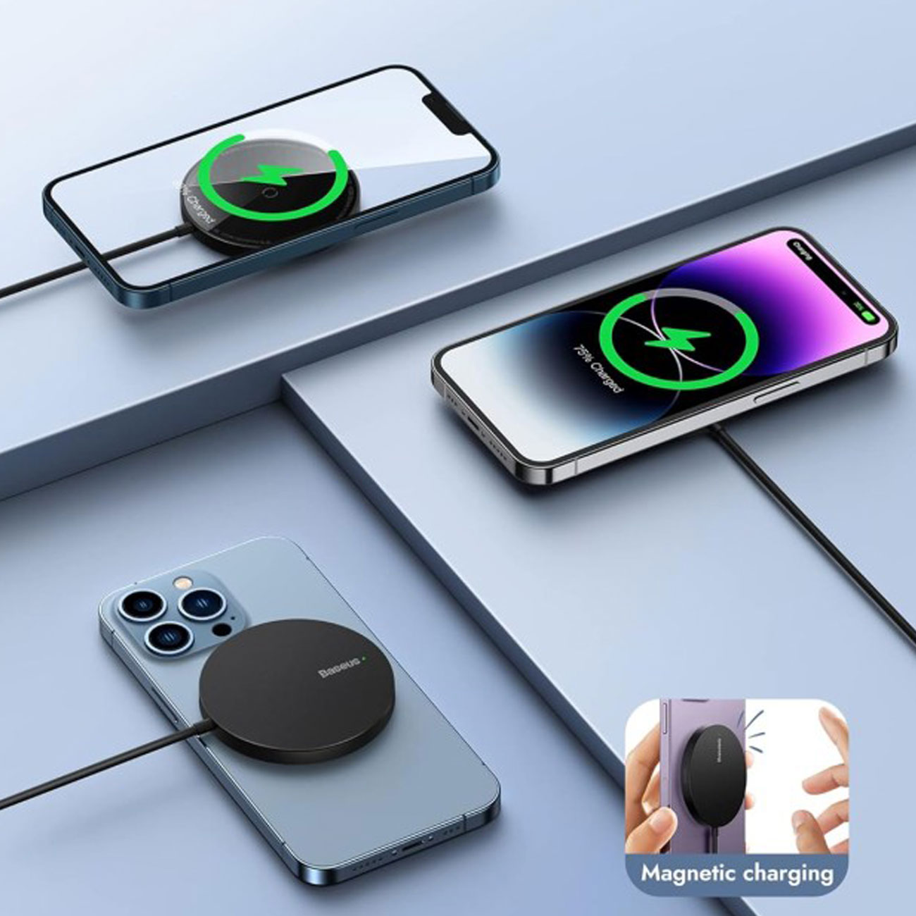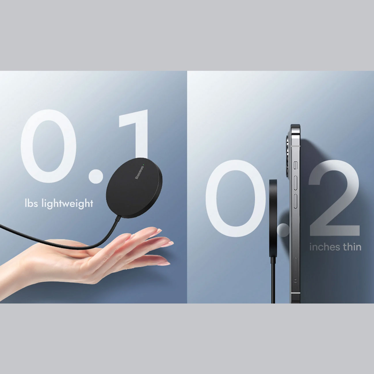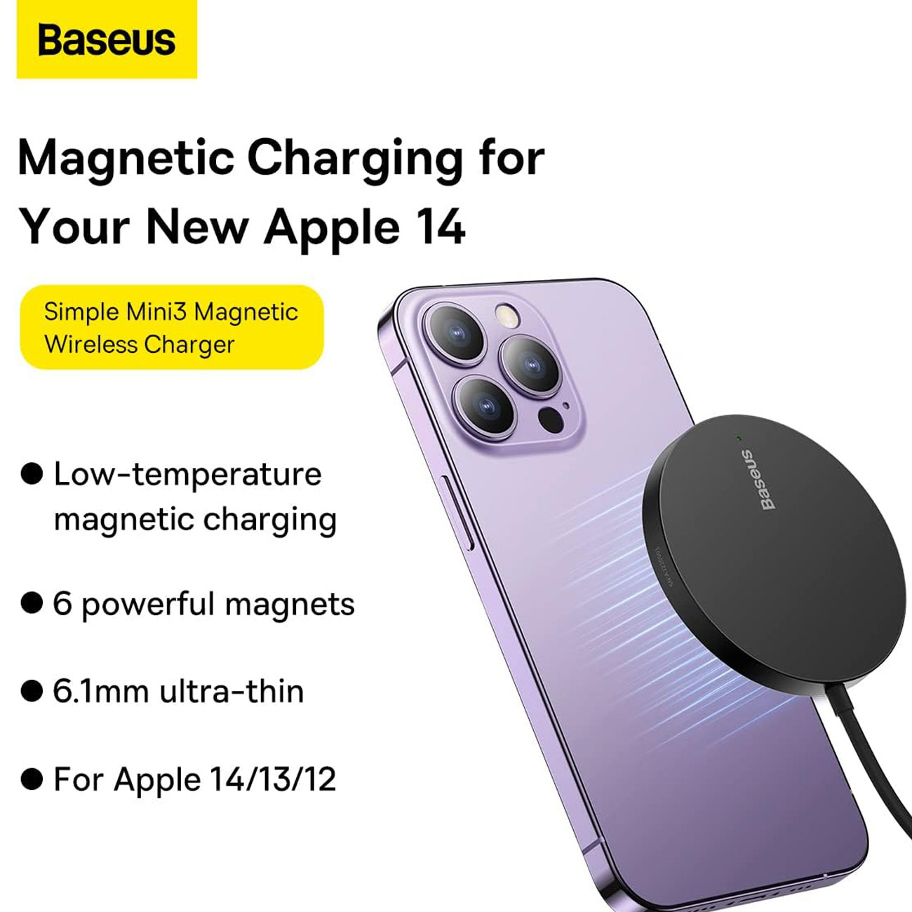 شارژر وایرلس مگنتی Baseus CCJJ040001 Mini3 با آهنرباهای N52، شارژ سریع تا ۱۵ وات، ضخامت تنها ۶٫۱ میلیمتر، وزن حدود ۴۶ گرم؛ مناسب دستگاههای پشتیبانیشده از MagSafe و Qi.