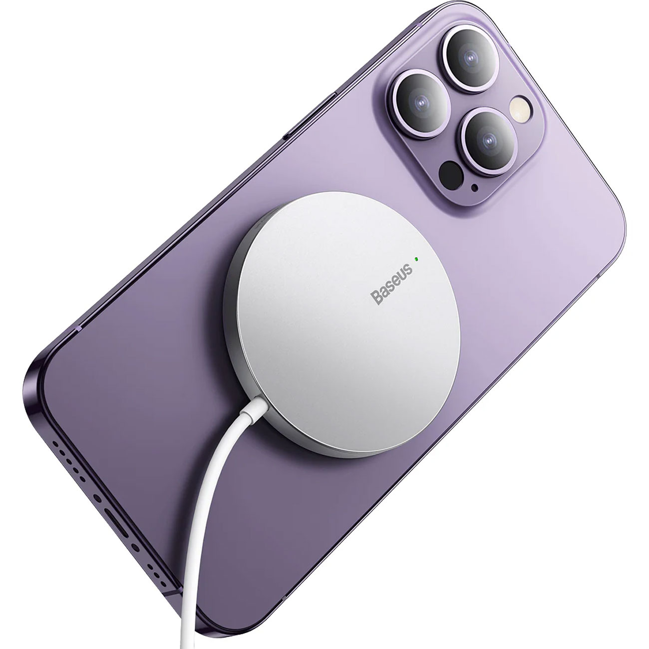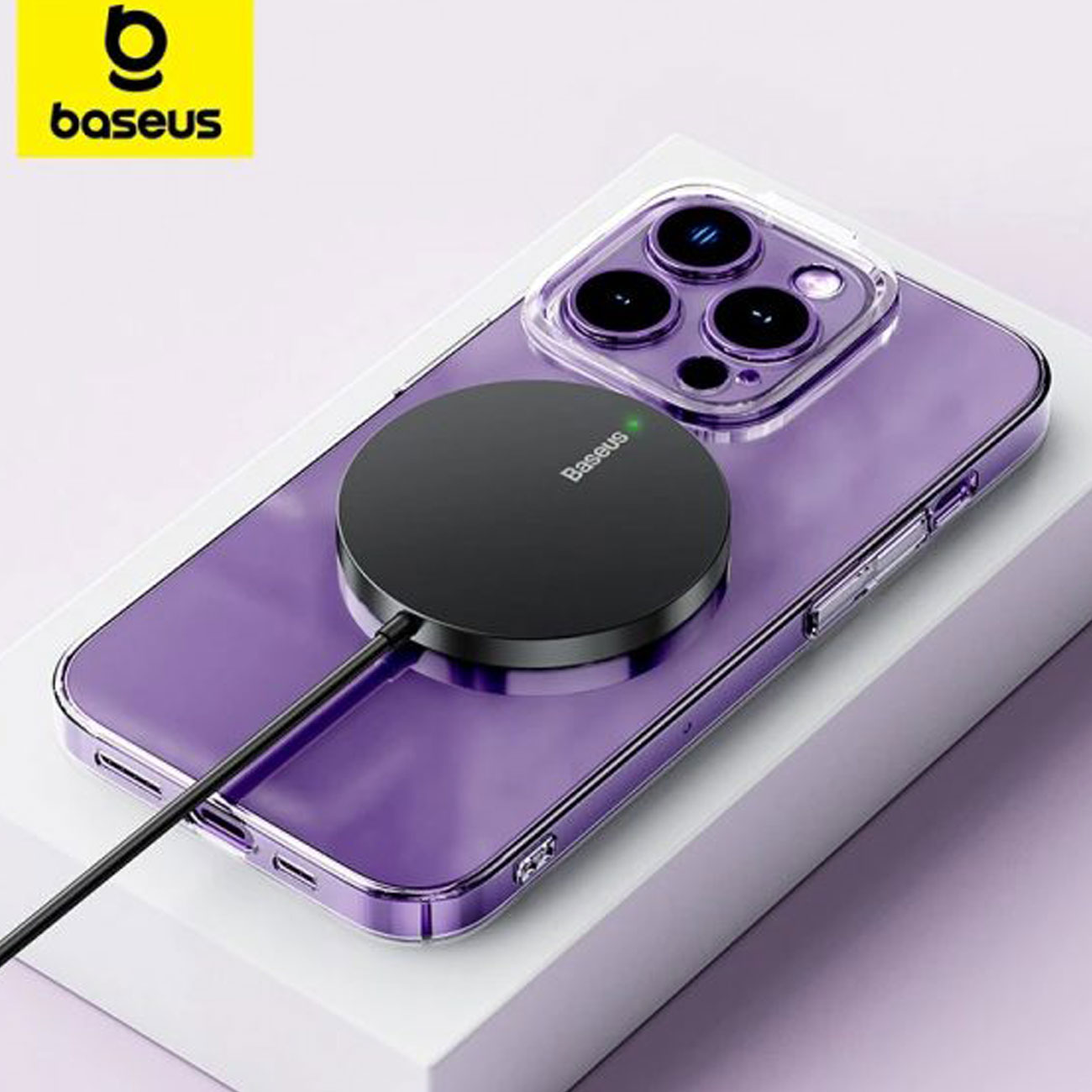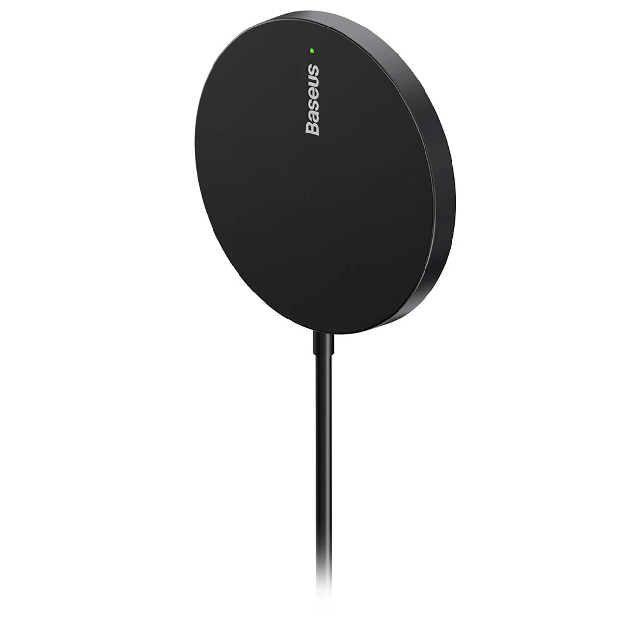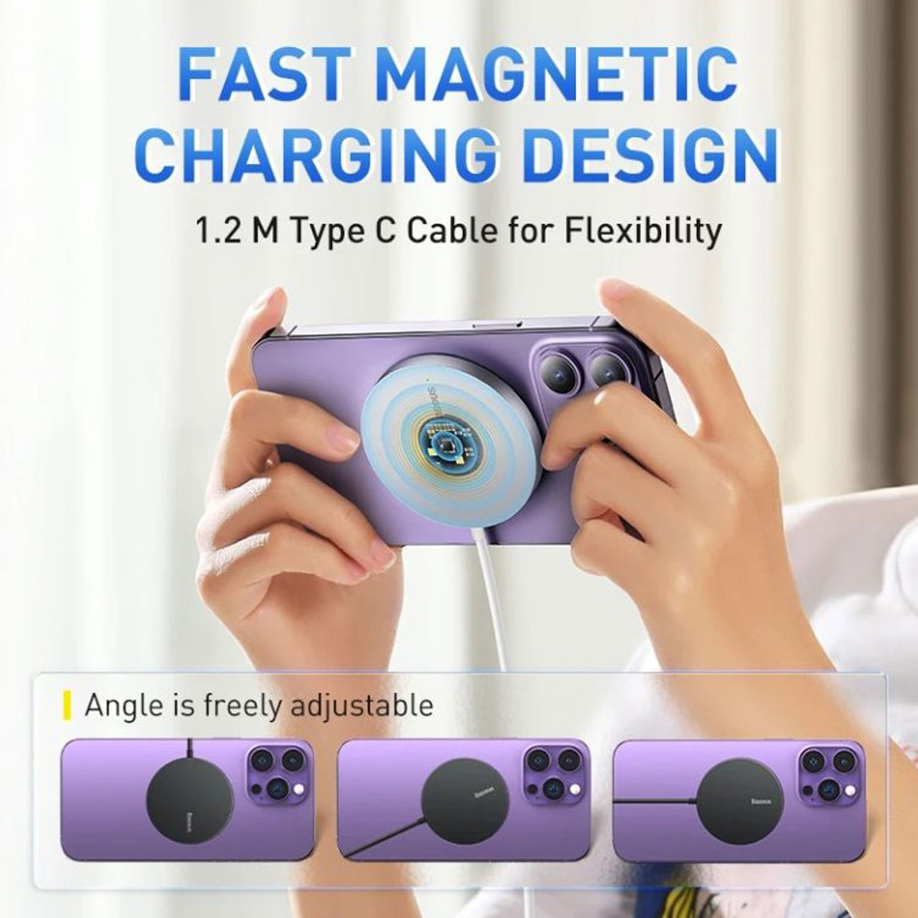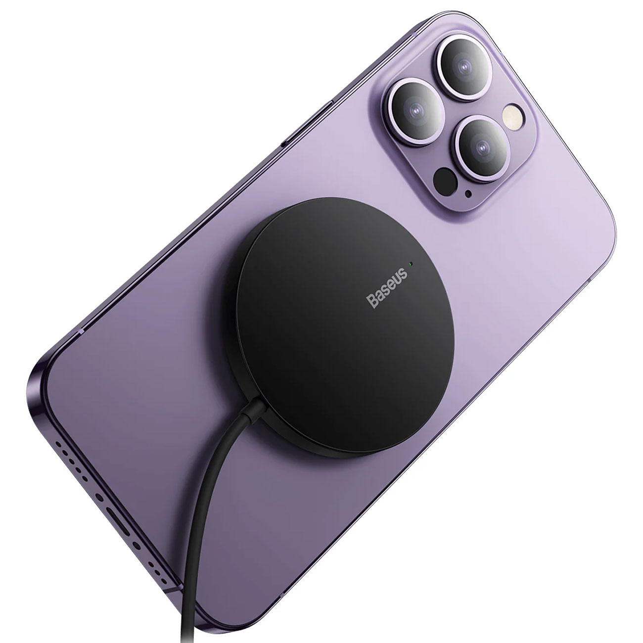 شارژر وایرلس مگنتی Baseus CCJJ040001 Mini3 با آهنرباهای N52، شارژ سریع تا ۱۵ وات، ضخامت تنها ۶٫۱ میلیمتر، وزن حدود ۴۶ گرم؛ مناسب دستگاههای پشتیبانیشده از MagSafe و Qi.
