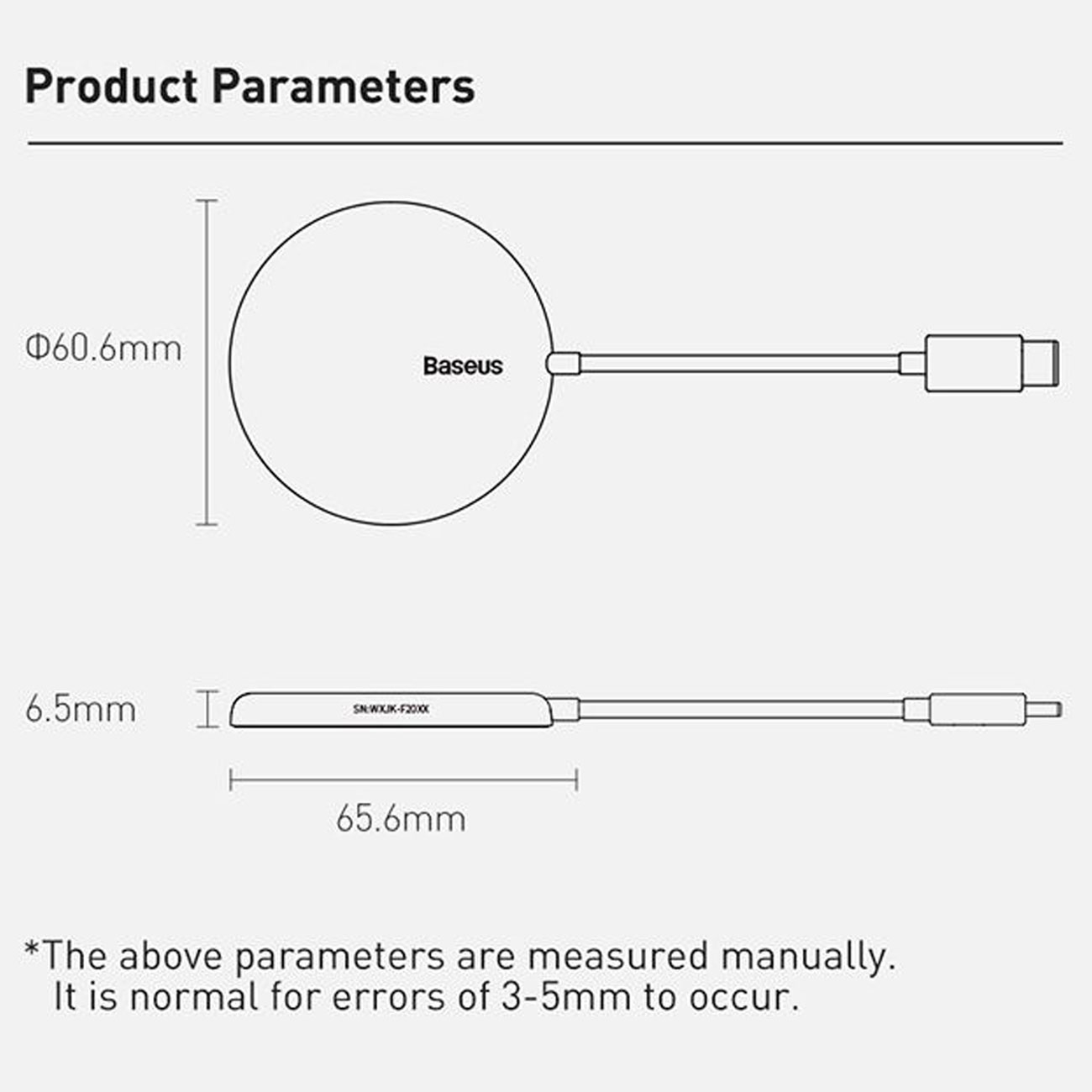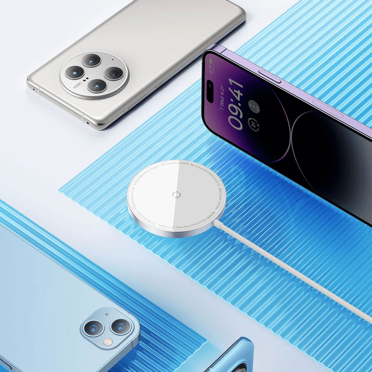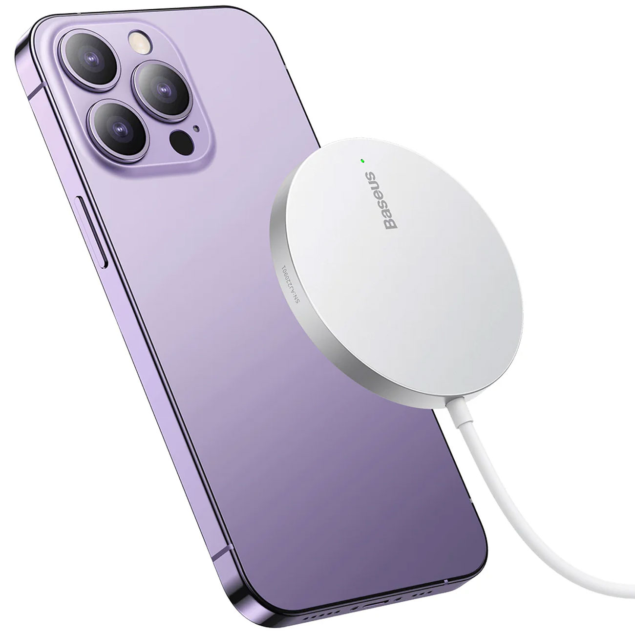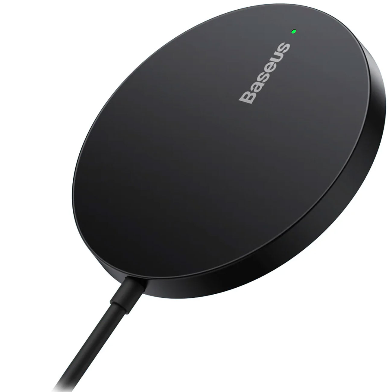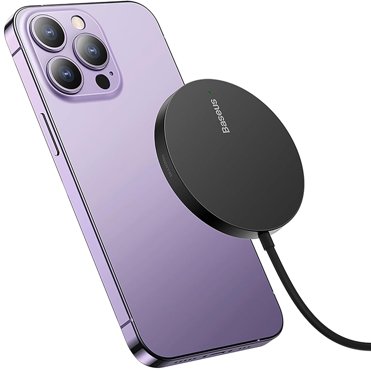 شارژر وایرلس مگنتی Baseus CCJJ040001 Mini3 با آهنرباهای N52، شارژ سریع تا ۱۵ وات، ضخامت تنها ۶٫۱ میلیمتر، وزن حدود ۴۶ گرم؛ مناسب دستگاههای پشتیبانیشده از MagSafe و Qi.