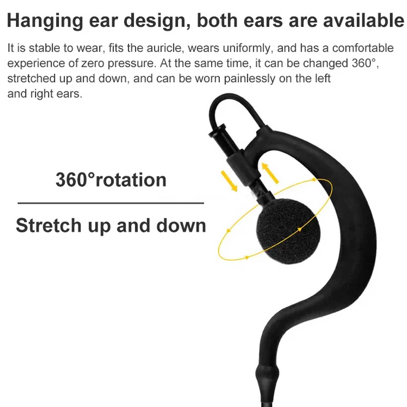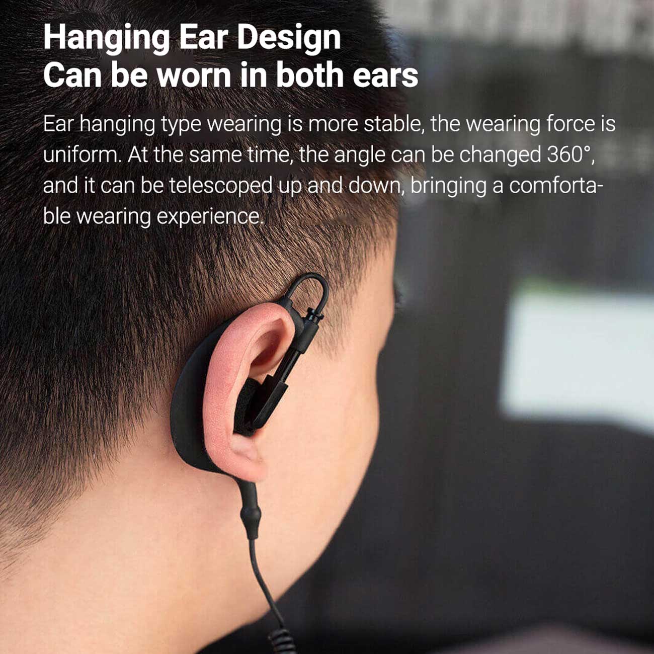 - طراحی تکگوش (Ear-Hook) با قابلیت استفاده در گوش چپ و راست؛ قلاب قرارگیری راحت و مطمئن.