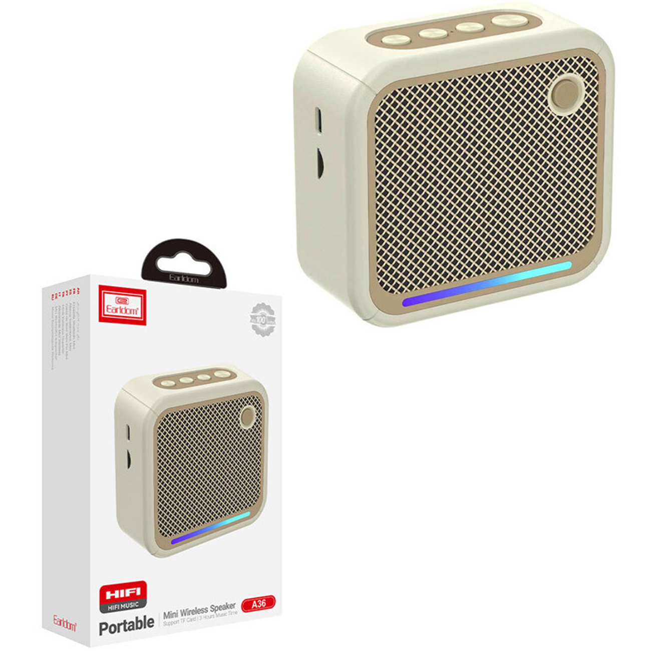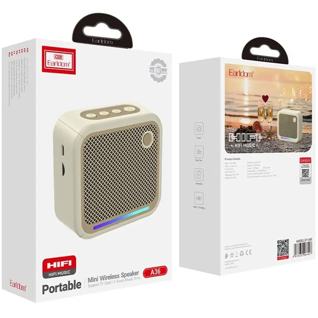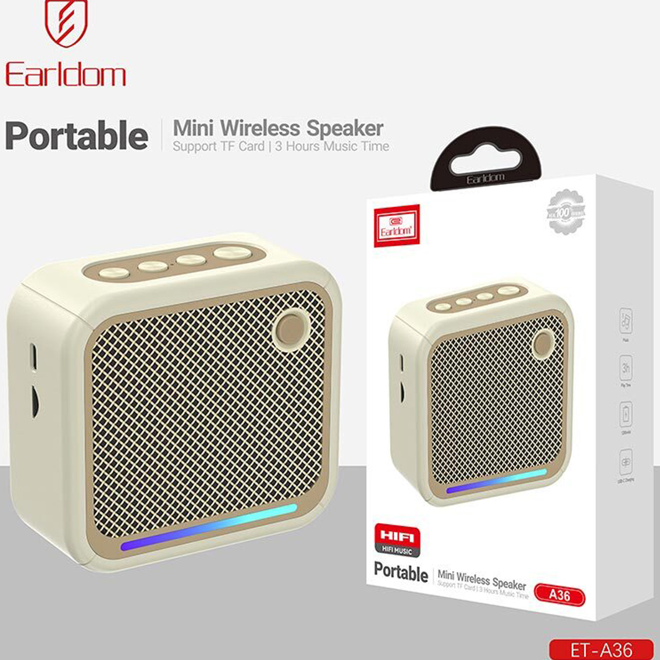 اسپیکر بلوتوثی قابلحمل ارلدام ET-A36 با بلوتوث 5.3، توان ۵ وات، باتری ۱۲۰۰mAh با حدود ۳ ساعت پخش، پشتیبانی از کارت TF، TWS، نورپردازی RGB و وزن ۱۸۰ گرم؛ مناسب استفاده روزمره و مهمانی کوچک.