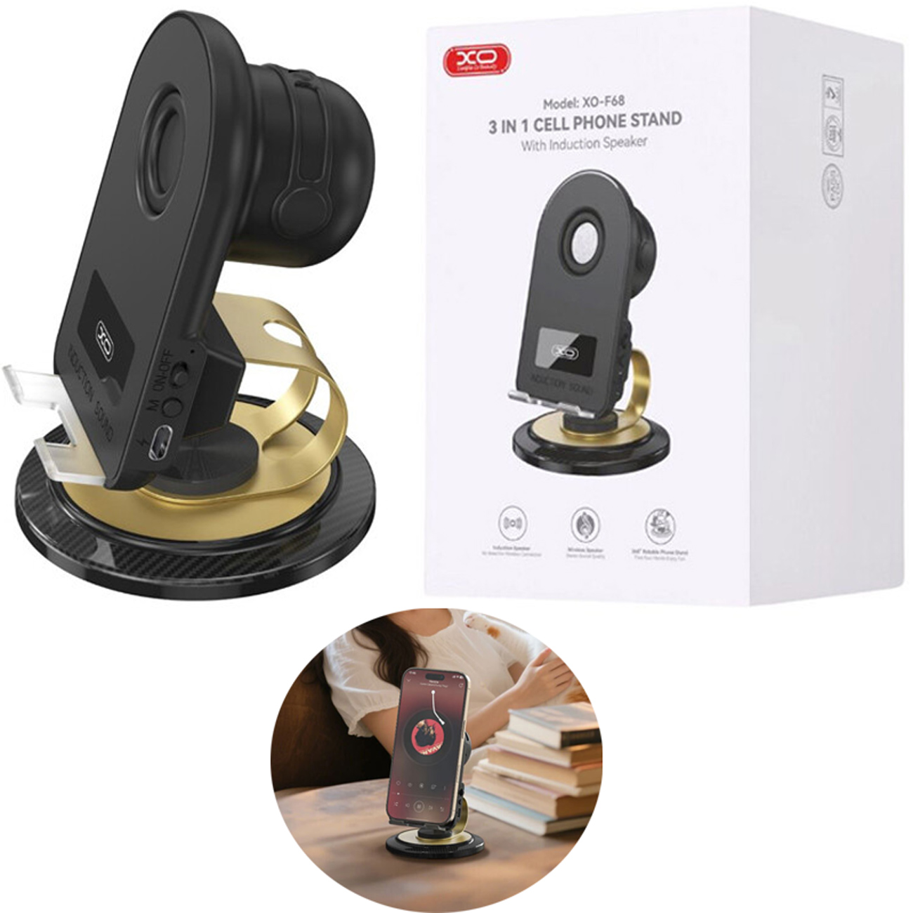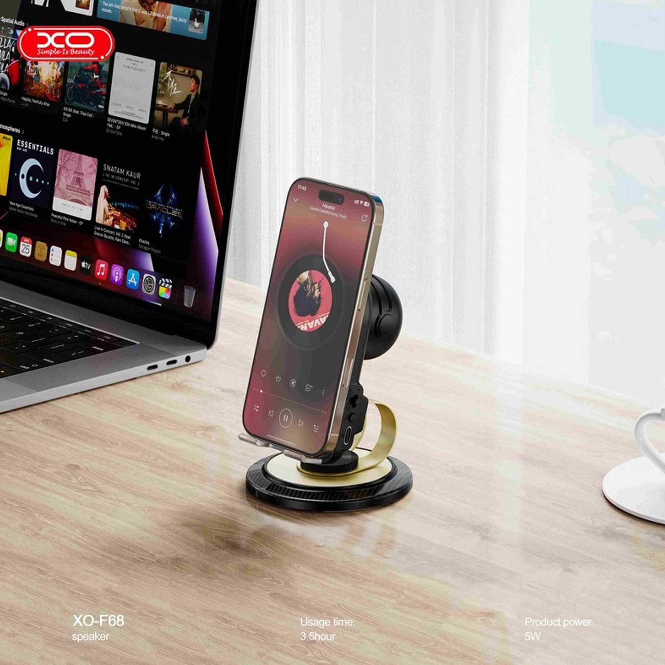 هولدر رومیزی اسپیکردار XO F68 گوشیتو ثابت نگه میداره و همزمان با اسپیکر قدرتمندش صدا رو تقویت میکنه. مناسب فیلم دیدن، تماس تصویری، موسیقی و میز کار. سبک، شیک و کاملاً کاربردی.