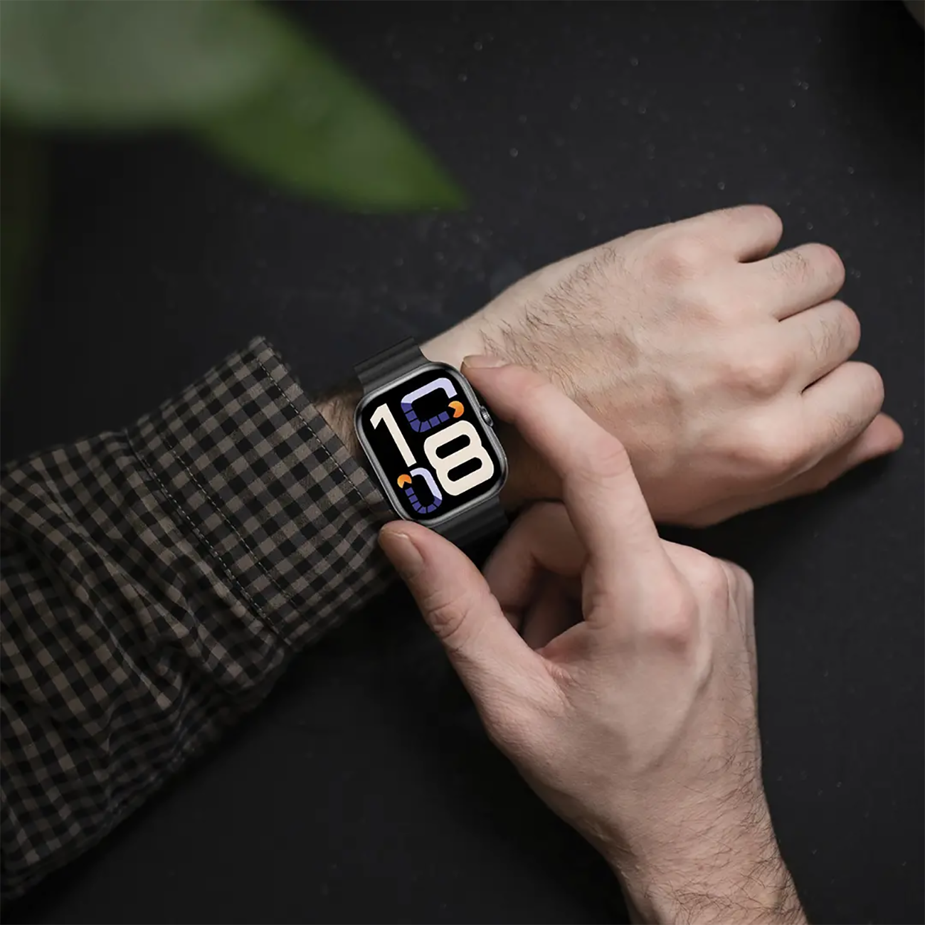 - بدنه با ترکیب آلیاژ فلزی + بند سیلیکونی؛ سبک، مقاوم و مناسب استفاده طولانیمدت.