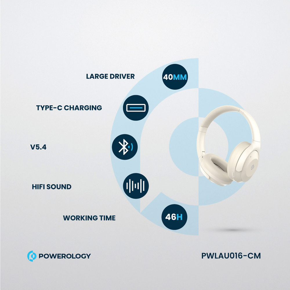 هدفون بیسیم حذف نویز ترکیبی پاورولوژی PWLAU016 با Hybrid ANC+ENC تا 40dB، ۵ میکروفون، صدای HiFi، بلوتوث 5.4، باتری 600mAh با 28 تا 46 ساعت پخش و جک 3.5 میلیمتری؛ مناسب موسیقی، کار و سفر.
