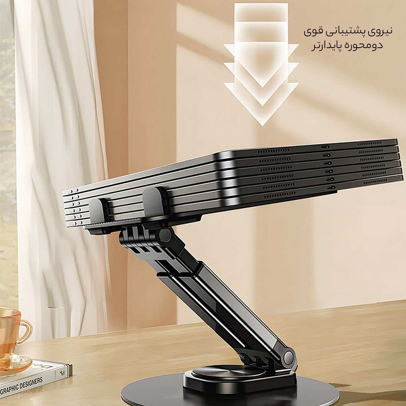بدنهی فلز کربنی با پوشش پودری، قابلیت تنظیم چندزاویهای، پایهی چرخان و طراحی تاشو، این مدل رو برای کار، مطالعه، کلاس آنلاین، تماس تصویری و تماشای فیلم خیلی کاربردی کرده.