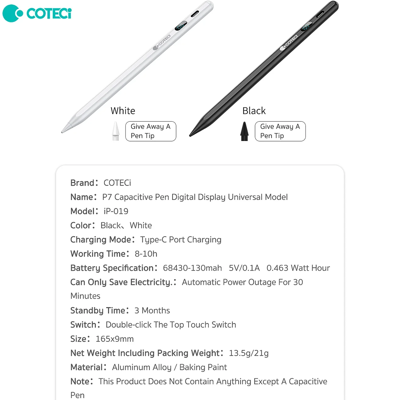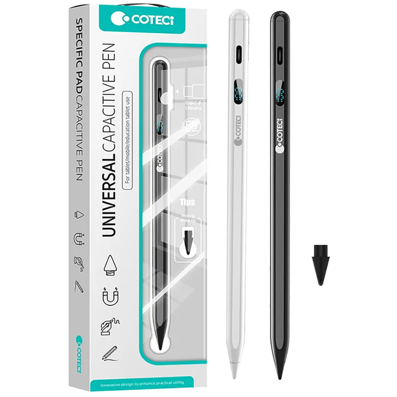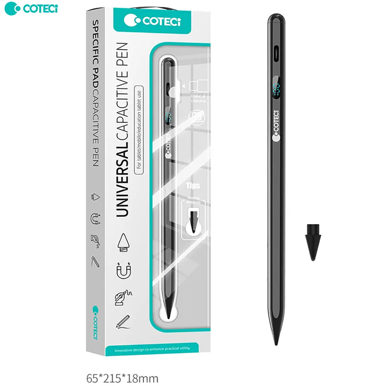 > قلم لمسی دیجیتالی کوتسی iP-019 با بدنه آلومینیومی، شارژ Type-C، نمایشگر باتری، پشتیبانی از Tilt، نوک قابل تعویض و سازگاری با اندروید، iOS و آیپد؛ مناسب طراحی و یادداشتبرداری.