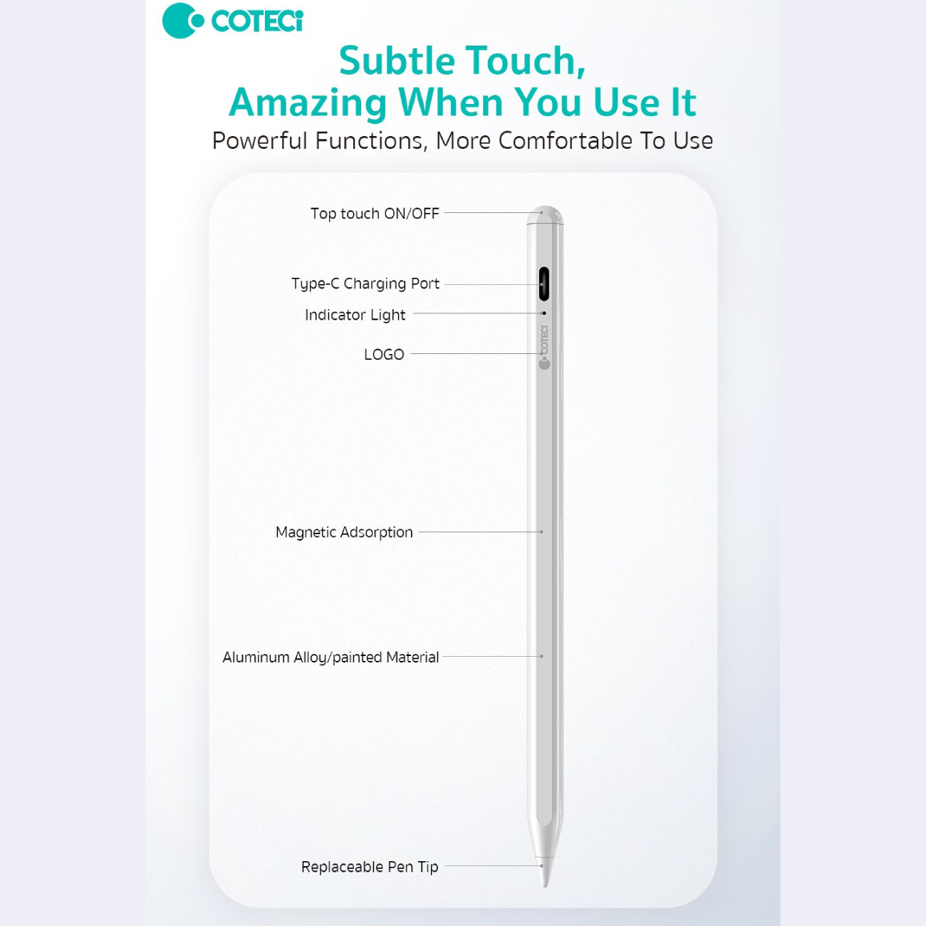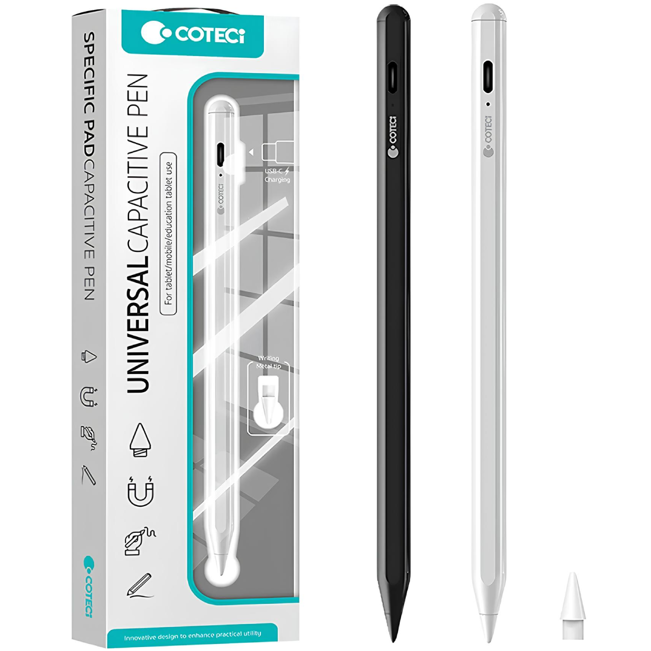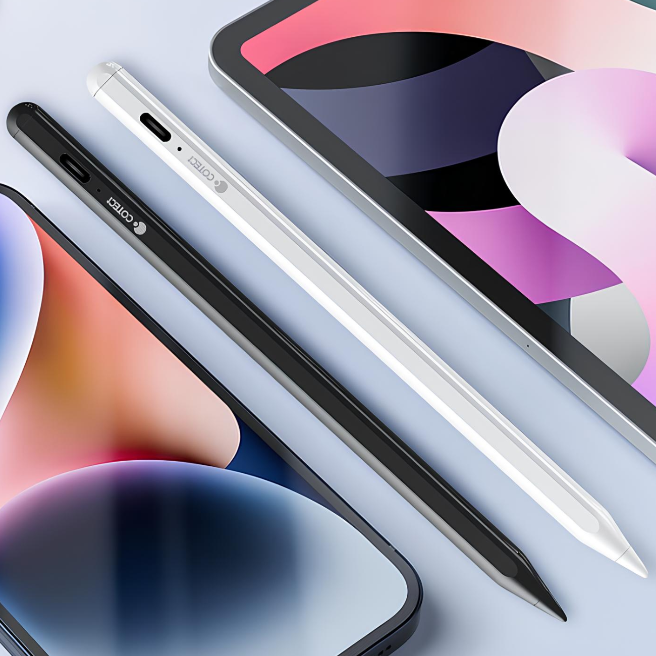 > قلم لمسی شارژی کوتسی iP-020 با بدنه آلومینیومی سبک، نوک بسیار دقیق قابلتعویض، تشخیص زاویه (Tilt)، ضد لمس اشتباه، مگنتی، باتری 130mAh با 8–10 ساعت استفاده و شارژ Type-C؛ مناسب اندروید، iOS و آیپد.