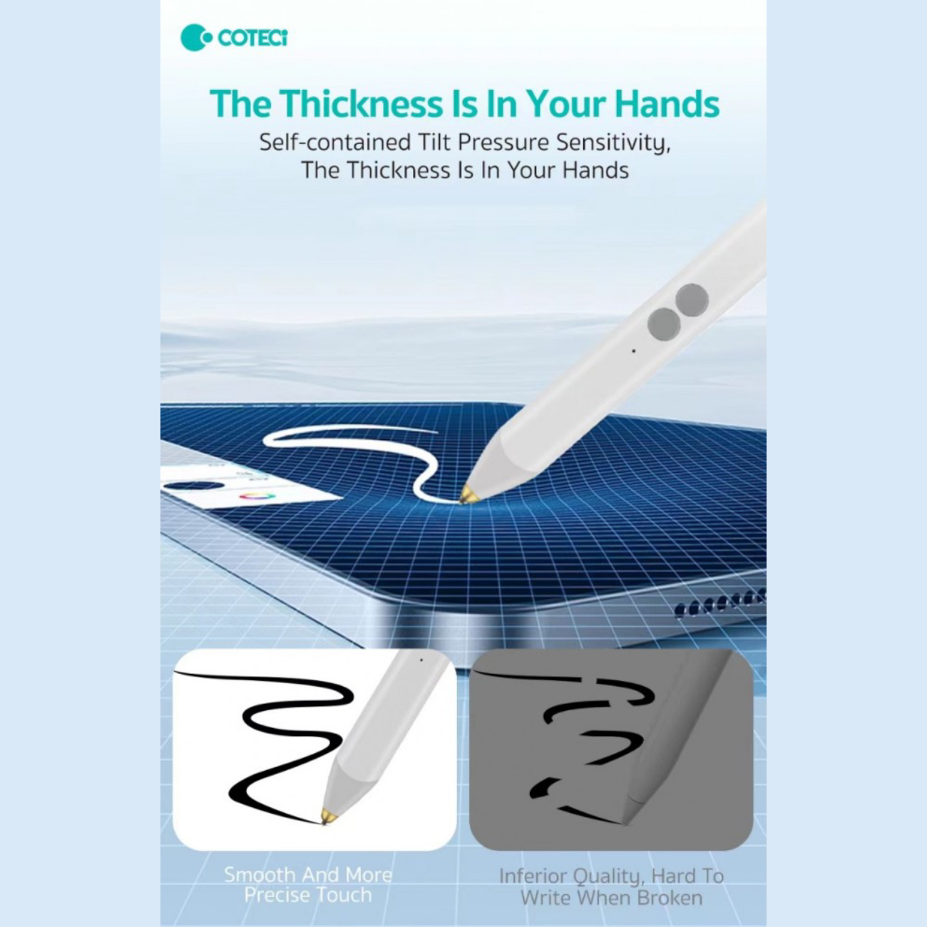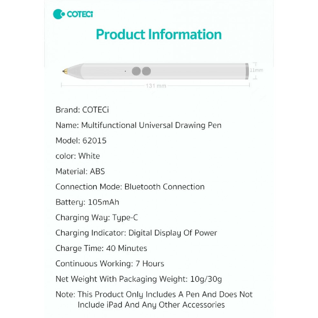 قلم لمسی چندکاره کوتتسی 62015 با بدنه آلومینیومی، اتصال بلوتوث 5.1، باتری 105mAh با شارژدهی تا ۷ ساعت، شارژ Type-C، اتصال مغناطیسی به آیپد و سازگار با iOS، اندروید و ویندوز.