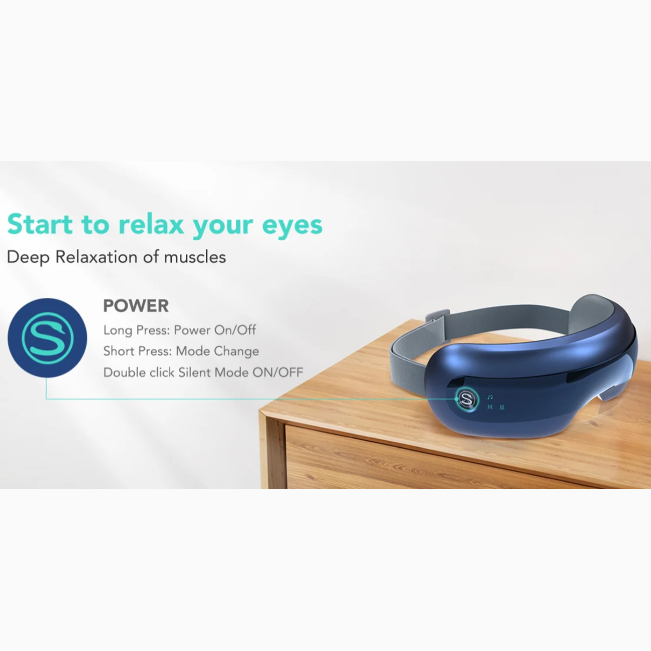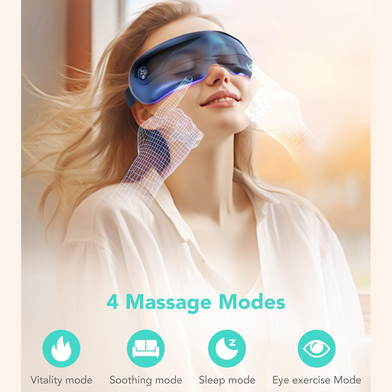 بسته به منبع، دستگاه ۴ حالت اصلی ماساژ (نشاط، تسکین، خواب، تمرین چشم) ارائه میدهد که ترکیبی از ماساژ فشاری، گرما و ویبره هستند تا خستگی و استرس اطراف چشم رو کاهش بدن.