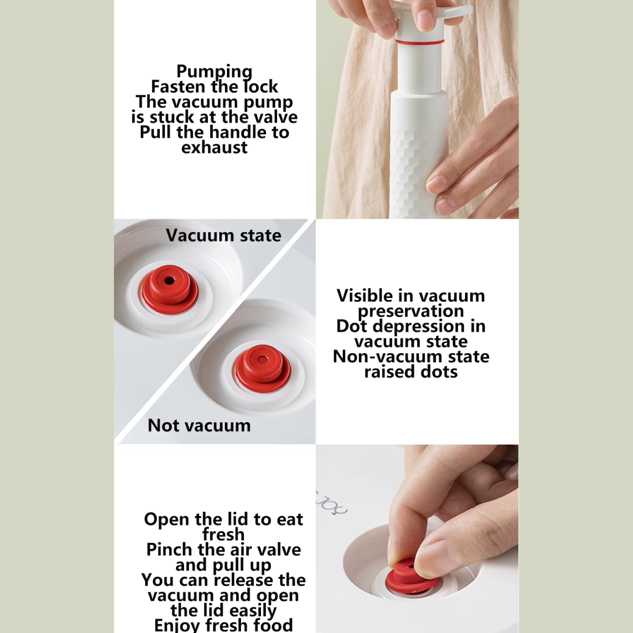 با چند حرکت ساده، هوای داخل ظرف رو تخلیه میکنه و کمک میکنه نوشیدنیها، مواد غذایی، سبزیجات، گوشت و خوراکیهای خشک مدت بیشتری تازه بمونن و دیرتر اکسید یا خراب بشن.