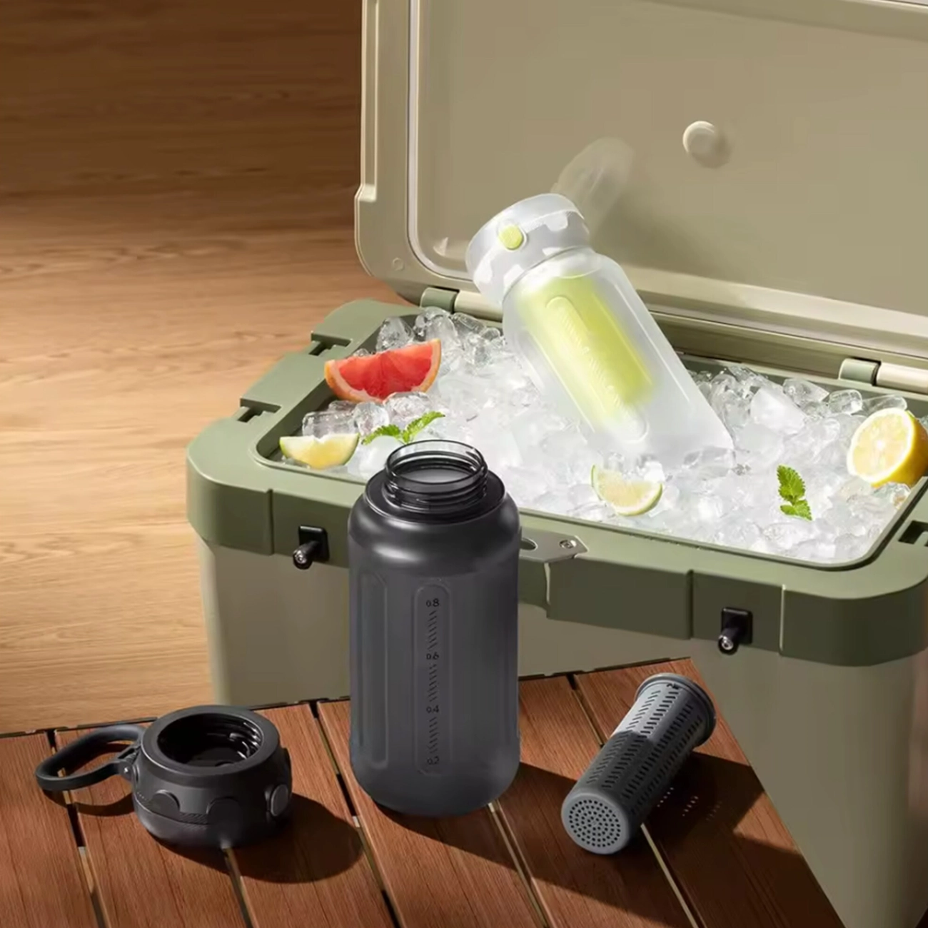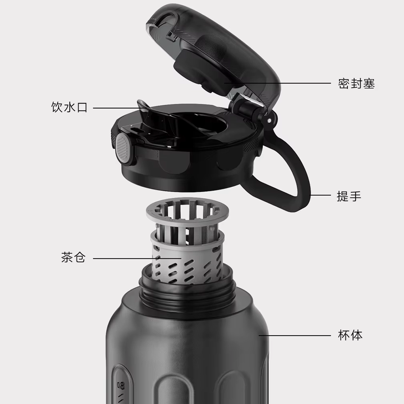قمقمه یک لیتری ورزشی میجیا شیائومی MJYDB01PL با بدنه تریتان بدون BPA، تحمل دما از -10 تا 95 درجه، درب دکمهای با قفل خودکار، آببندی 360 درجه ضدنشت، صافی چای/میوه و بند سیلیکونی؛ مناسب ورزش، کار، خانه و سفر.