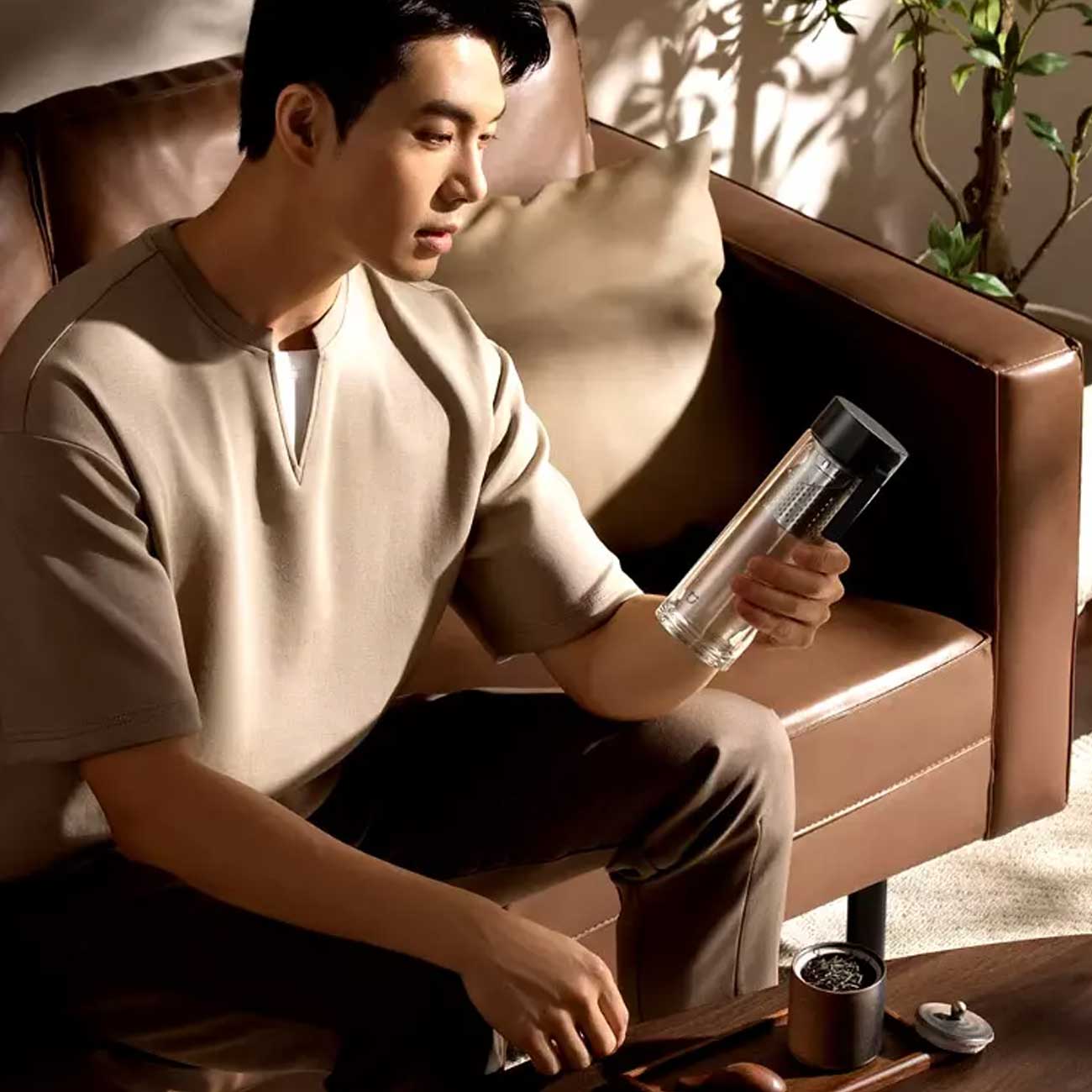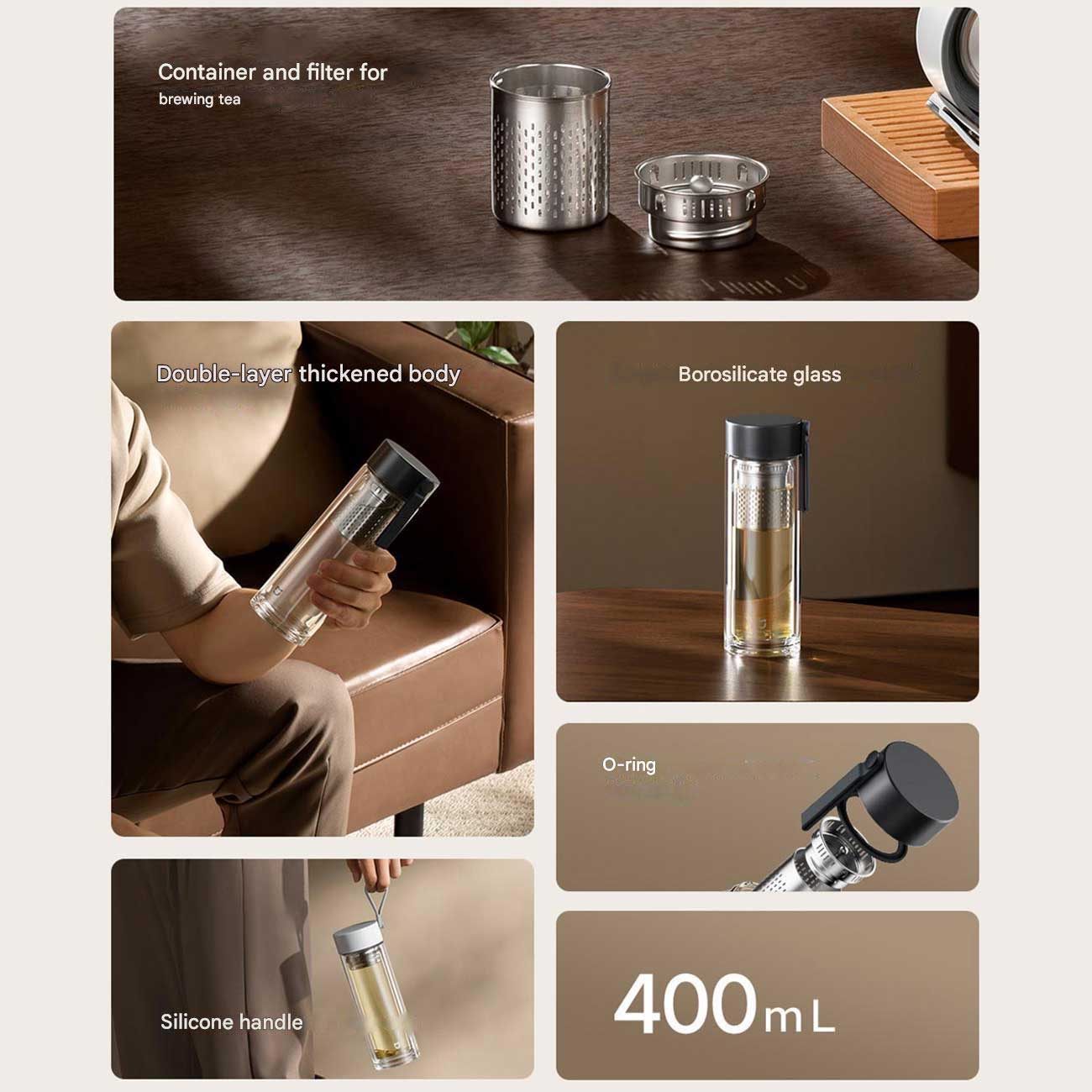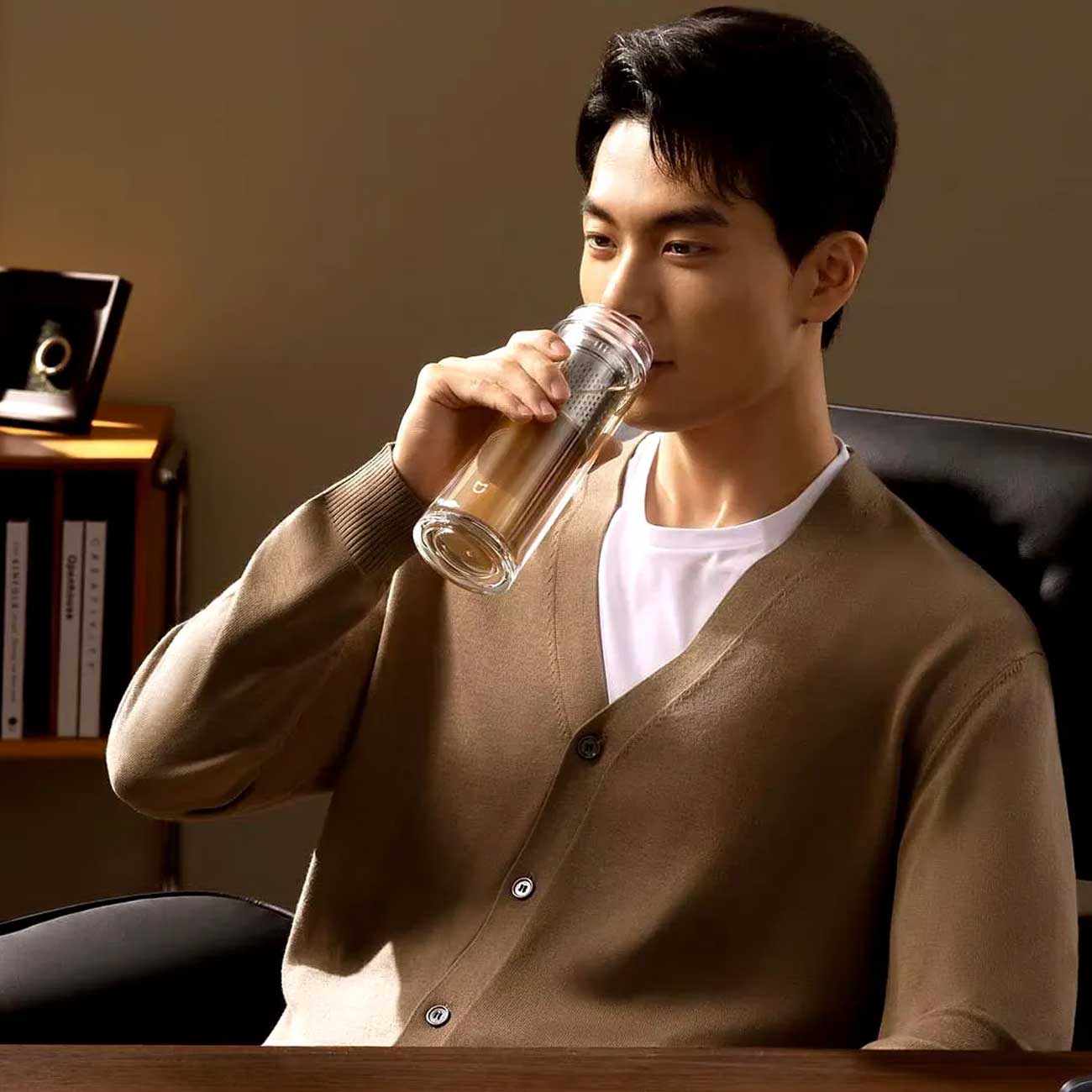 > فلاسک شیشهای دو لایه مسافرتی میجیا شیائومی MJBLB01PL با بدنه شیشه بوروسیلیکات دوجداره، صافی چای استیل 316L، ظرفیت 400 میلیلیتر، تحمل دما از -20 تا 100 درجه و حلقه آببندی 360 درجه ضدنشت؛ مناسب نوشیدنی