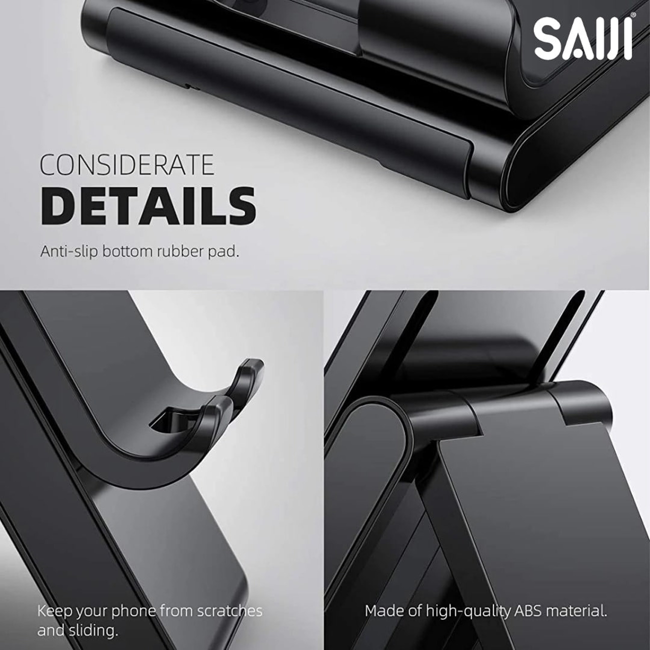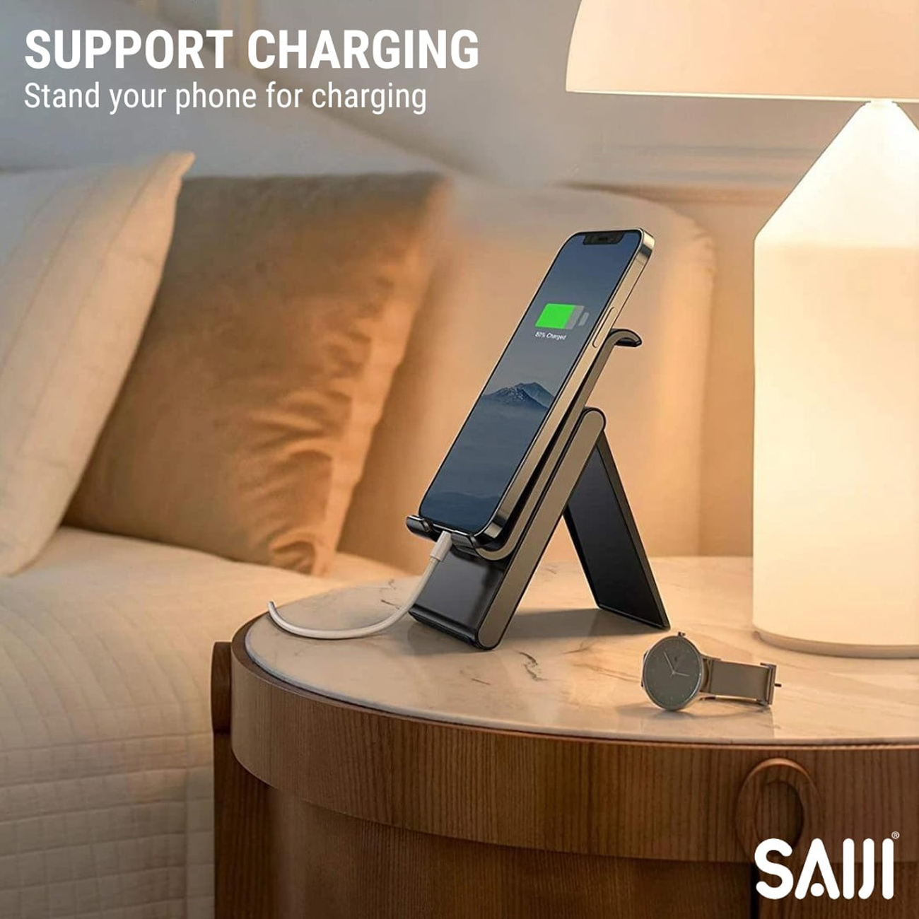 هولدر موبایل رومیزی تاشو SAIJI S0 PLUS با قابلیت تنظیم زاویه 0–120 درجه، پایه فلزی آلومینیومی، پدهای سیلیکونی ضدلغزش و ارتفاع بهینه برای میز کار؛ مناسب موبایل و تبلت تا ۱۳ اینچ.