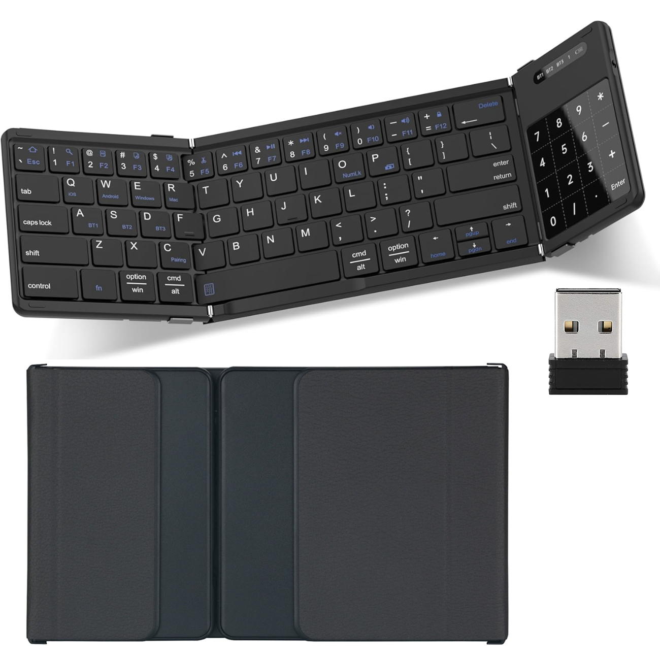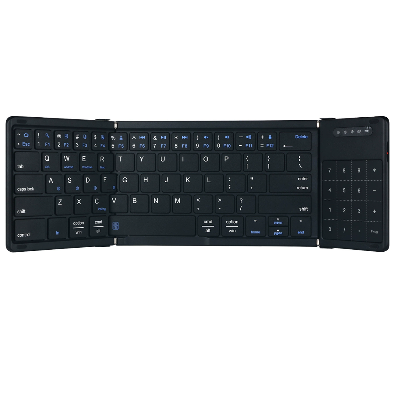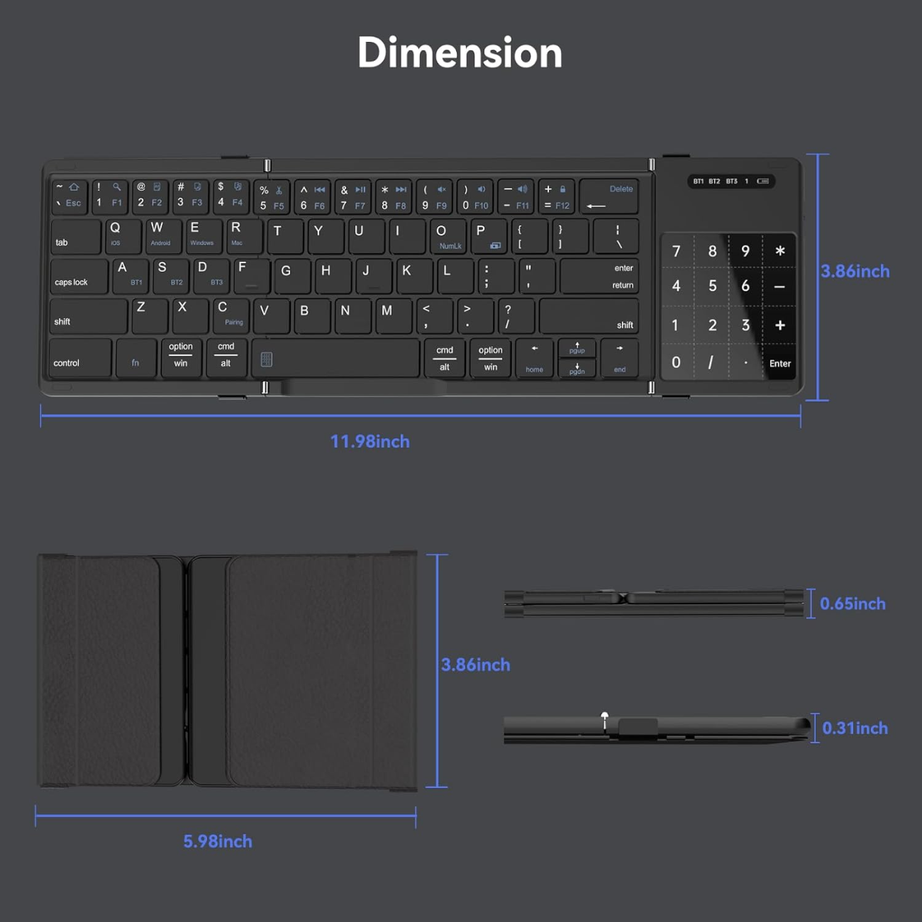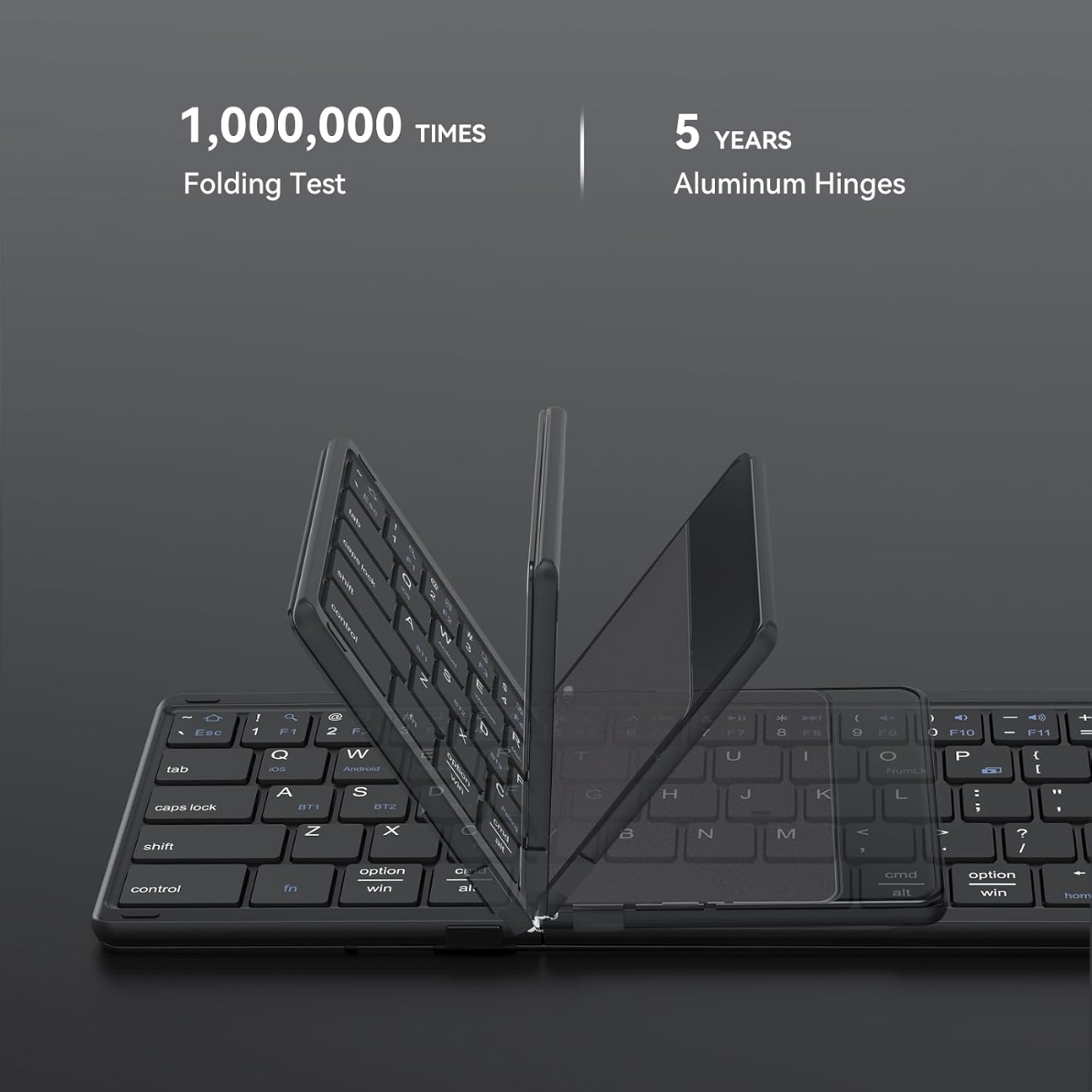 کیبورد بیسیم تاشو شارژی با تاچپد، اتصال بلوتوث، طراحی تاشو و جمعوجور، مناسب لپتاپ، تبلت و موبایل؛ ایدهآل برای سفر، کار بیرون از خانه و تایپ راحت در هرجا.