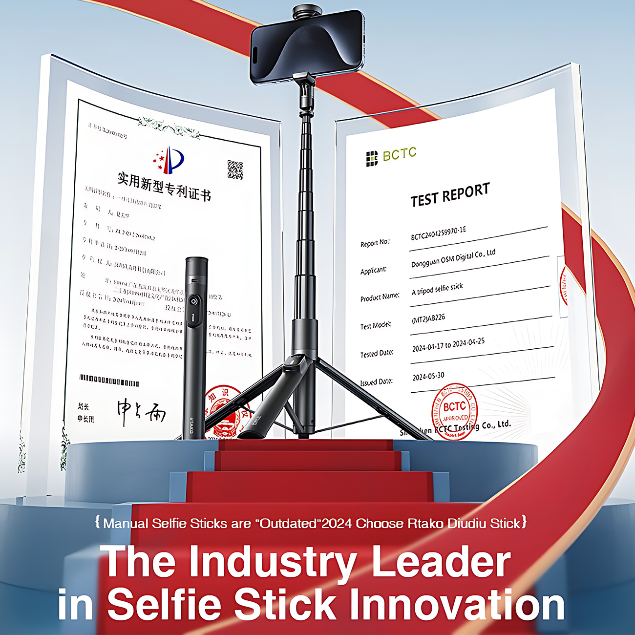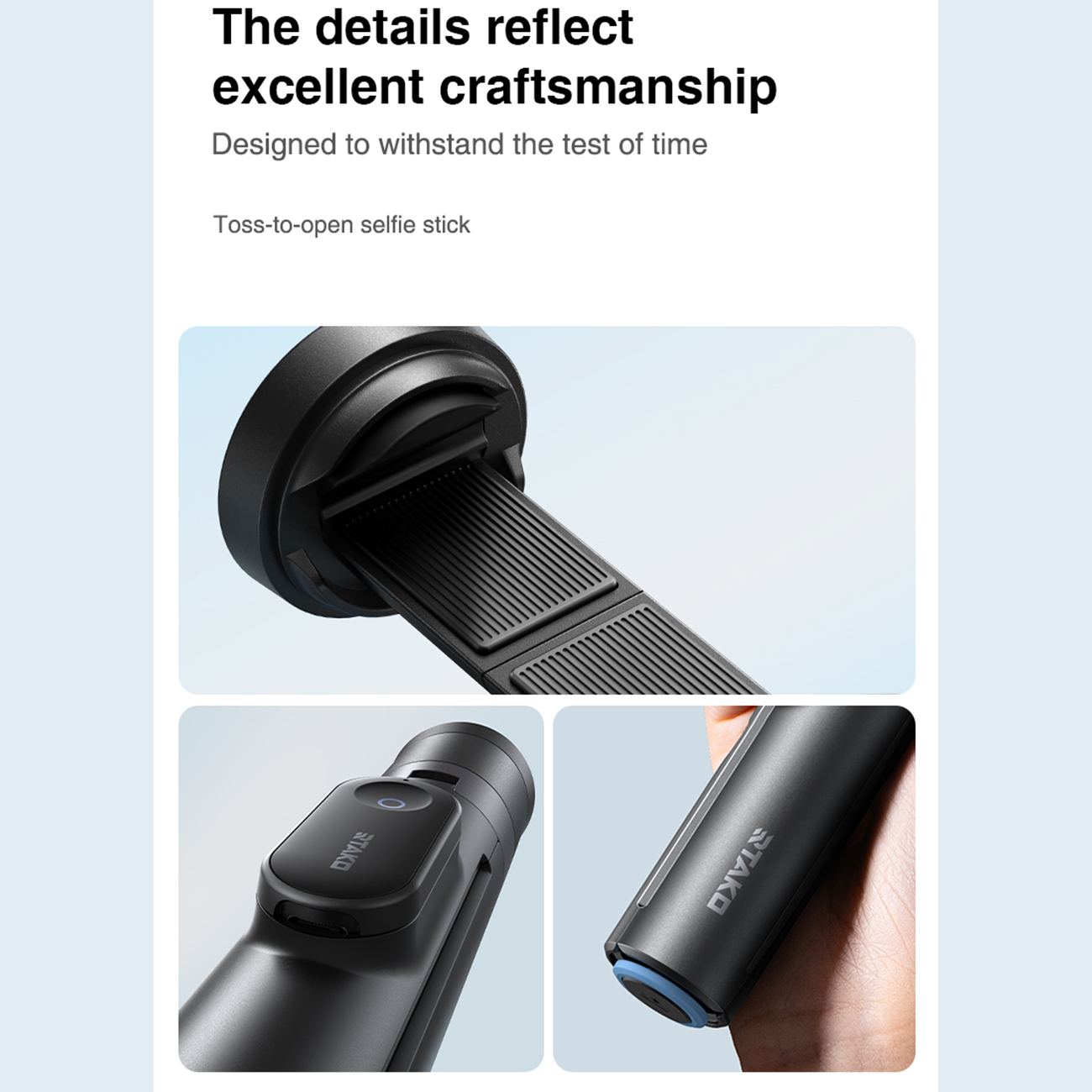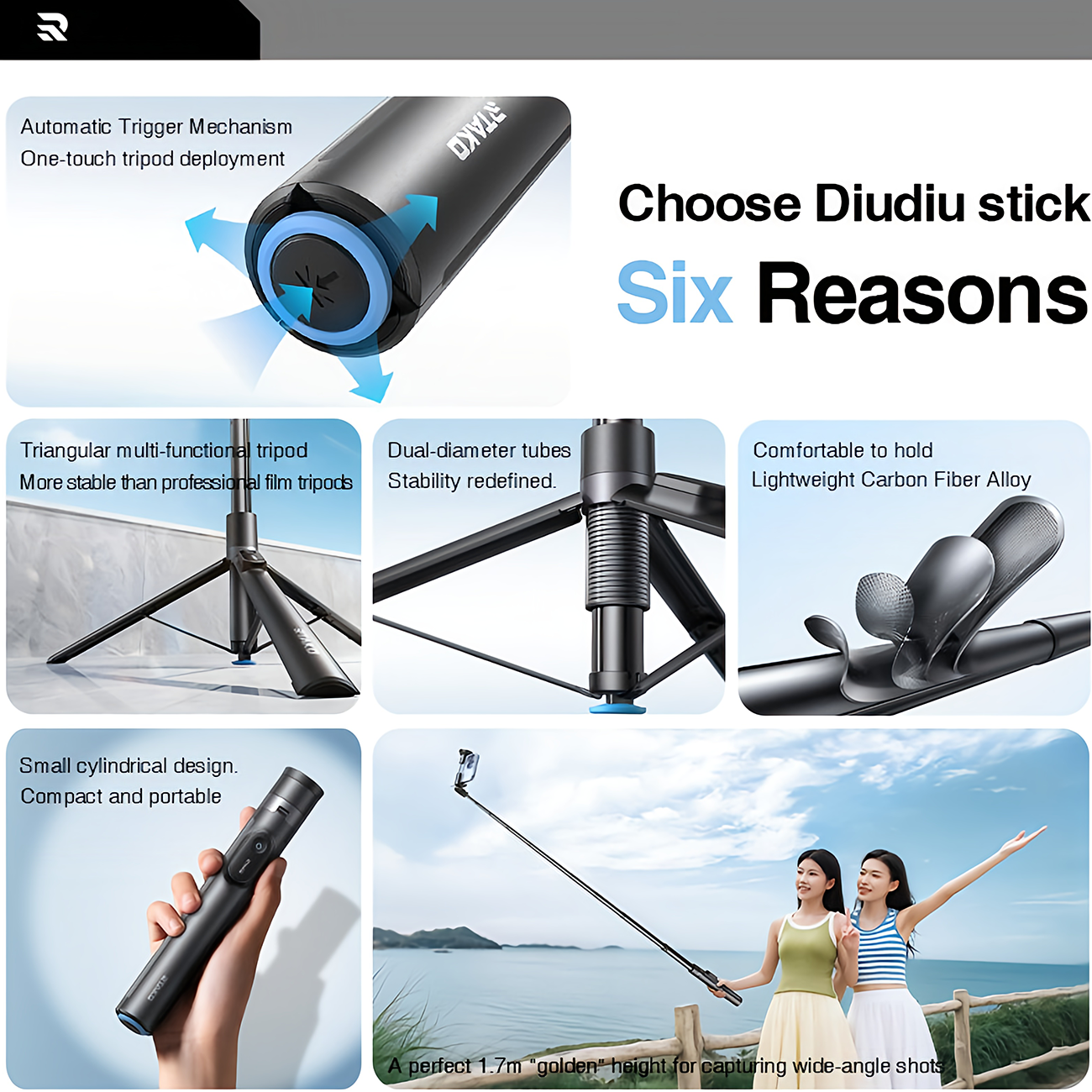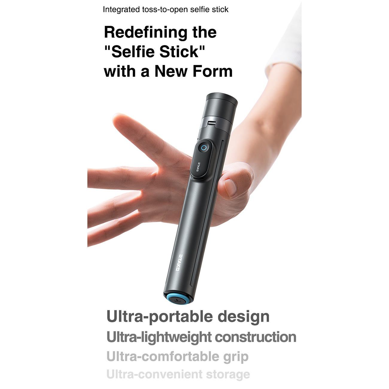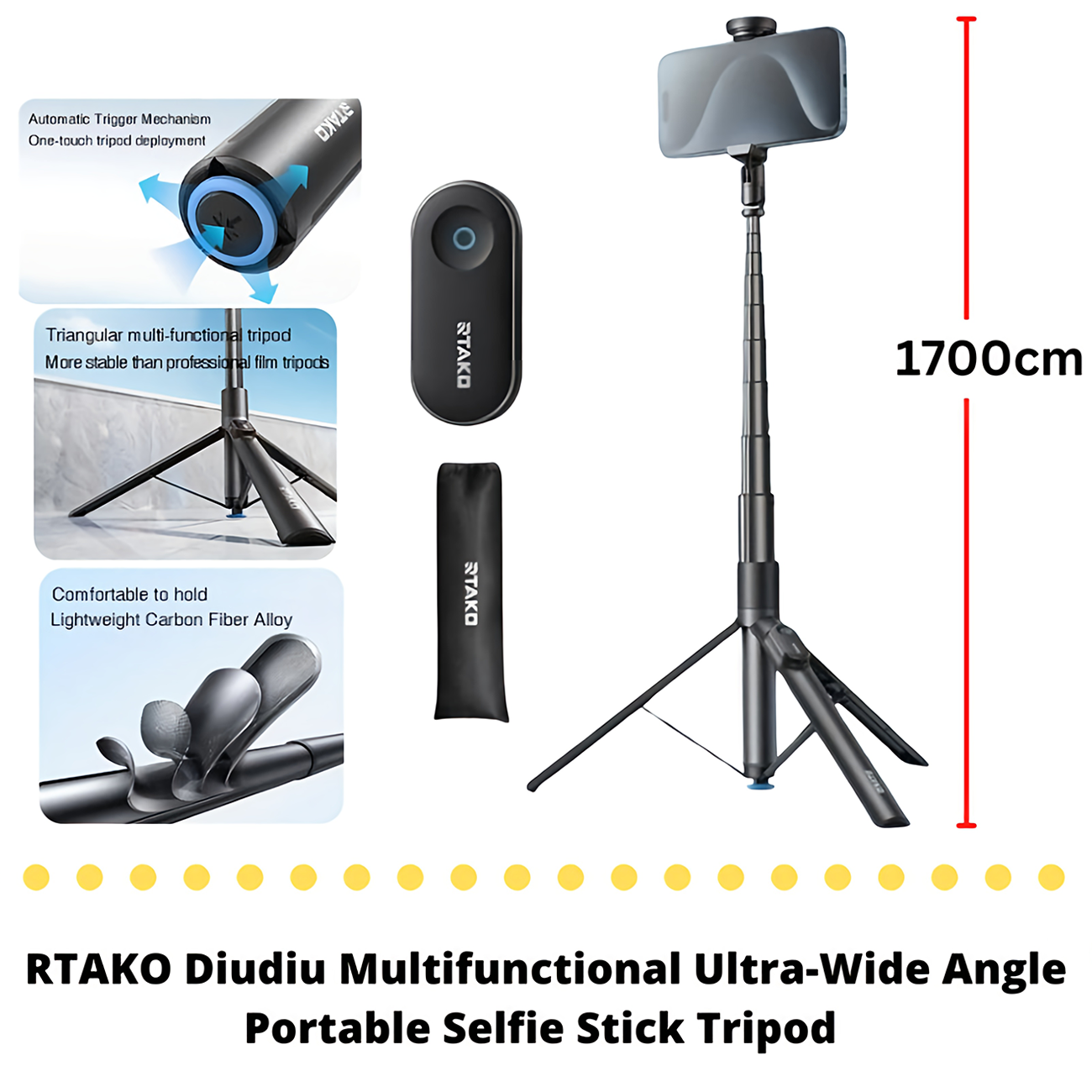 مونوپاد حرفهای شاتردار و سهپایه موبایل رتاکو RZP001-AB226 با طراحی یکپارچه، باز شدن خودکار پایهها، ارتفاع تا حدود 1.7 متر، ریموت بلوتوث مغناطیسی با برد 20 متر، زاویهپذیری 720 درجه و بدنه فیبرکربن+استیل