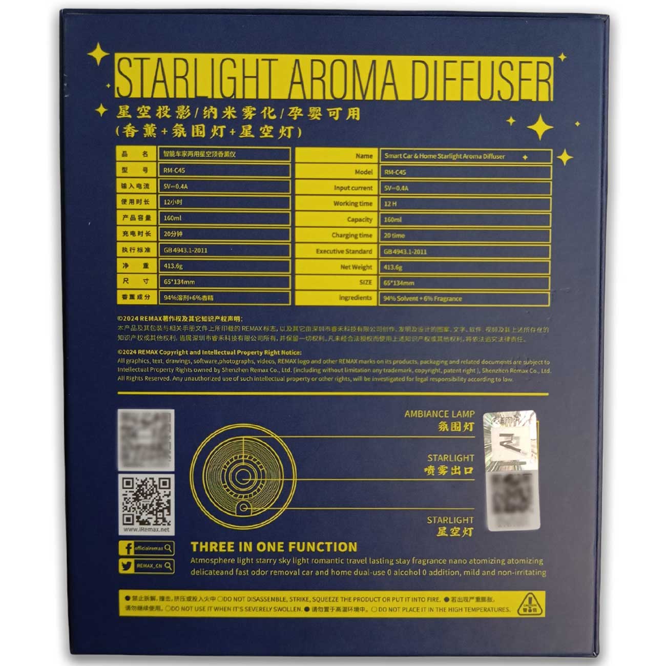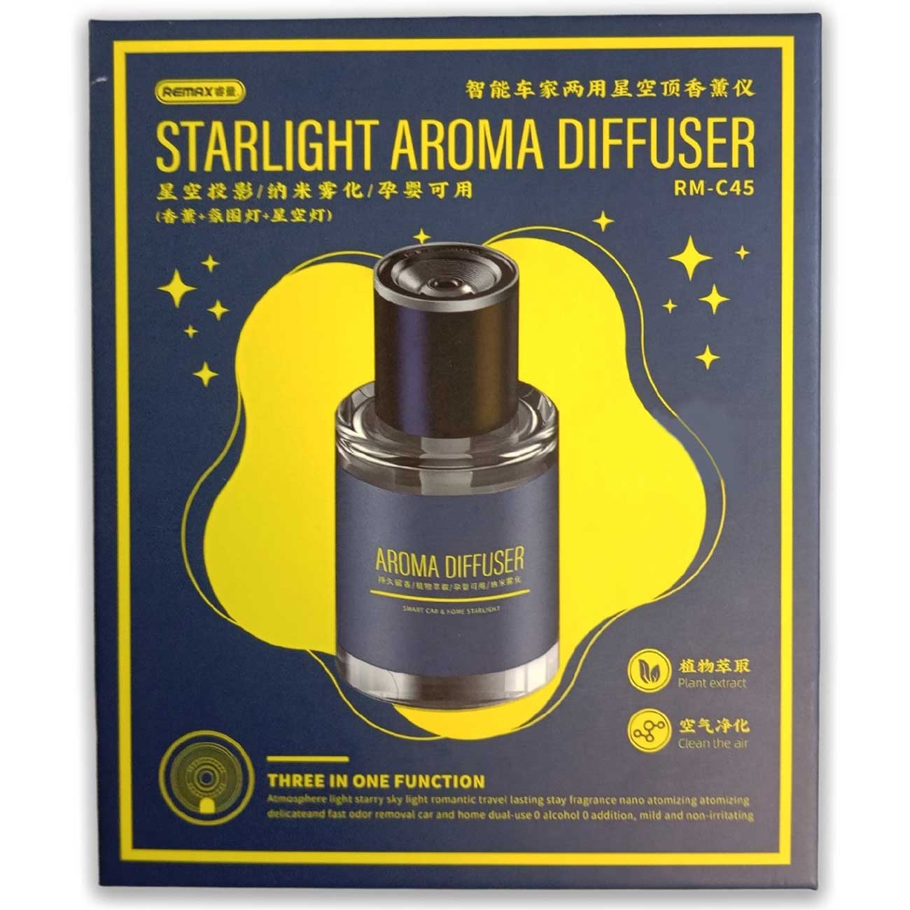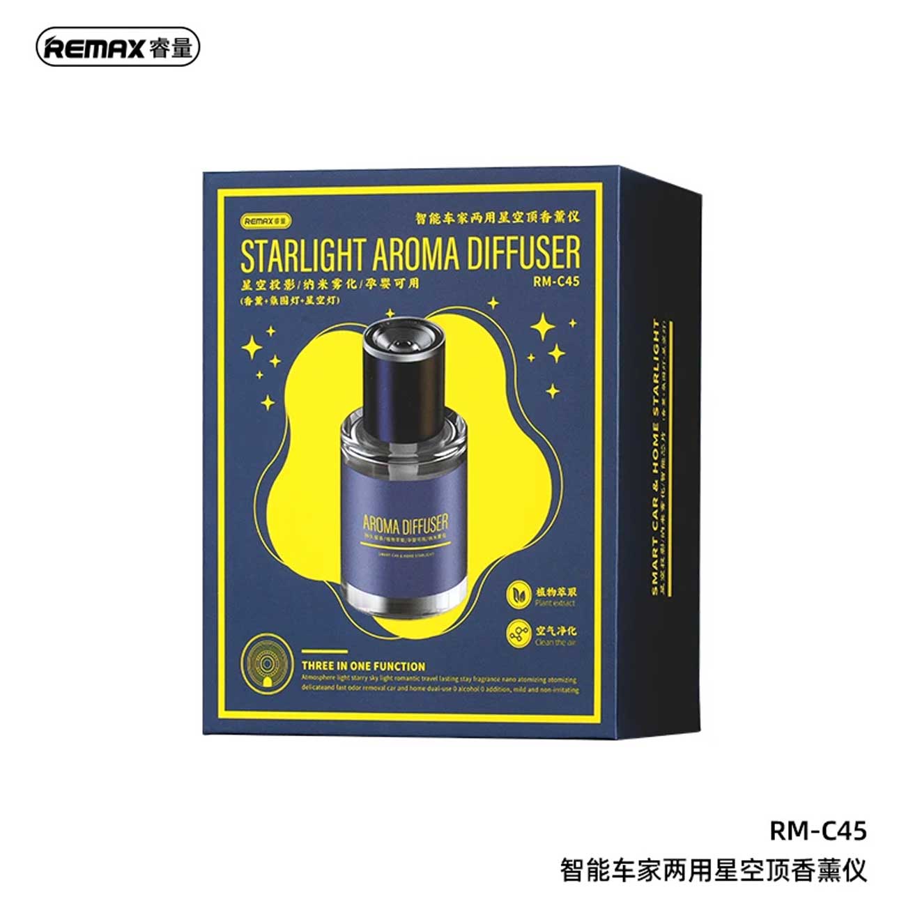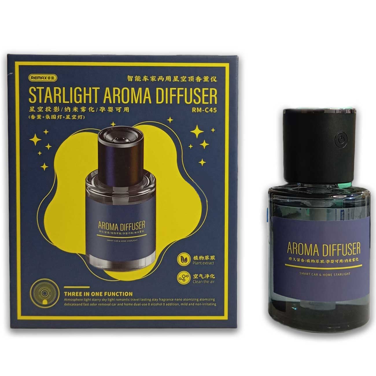 خوشبو کننده ماشین و خانه ریمکس RM-C45 با مخزن 160 میلیلیتری، افکت نوری آسمان پرستاره، طراحی شیشهای لوکس و پخش ملایم رایحه؛ مناسب استفاده در خودرو، خانه و محل کار.