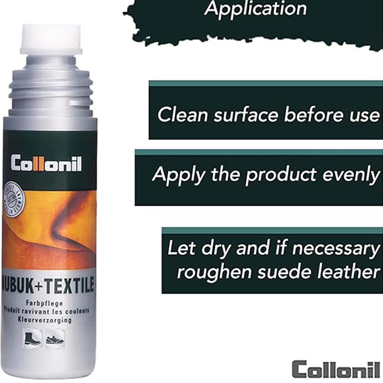 طبق توضیحات Collonil و فروشندهها، Nubuk+Textil علاوه بر احیای رنگ، یک لایه محافظ سبک هم ایجاد میکند: