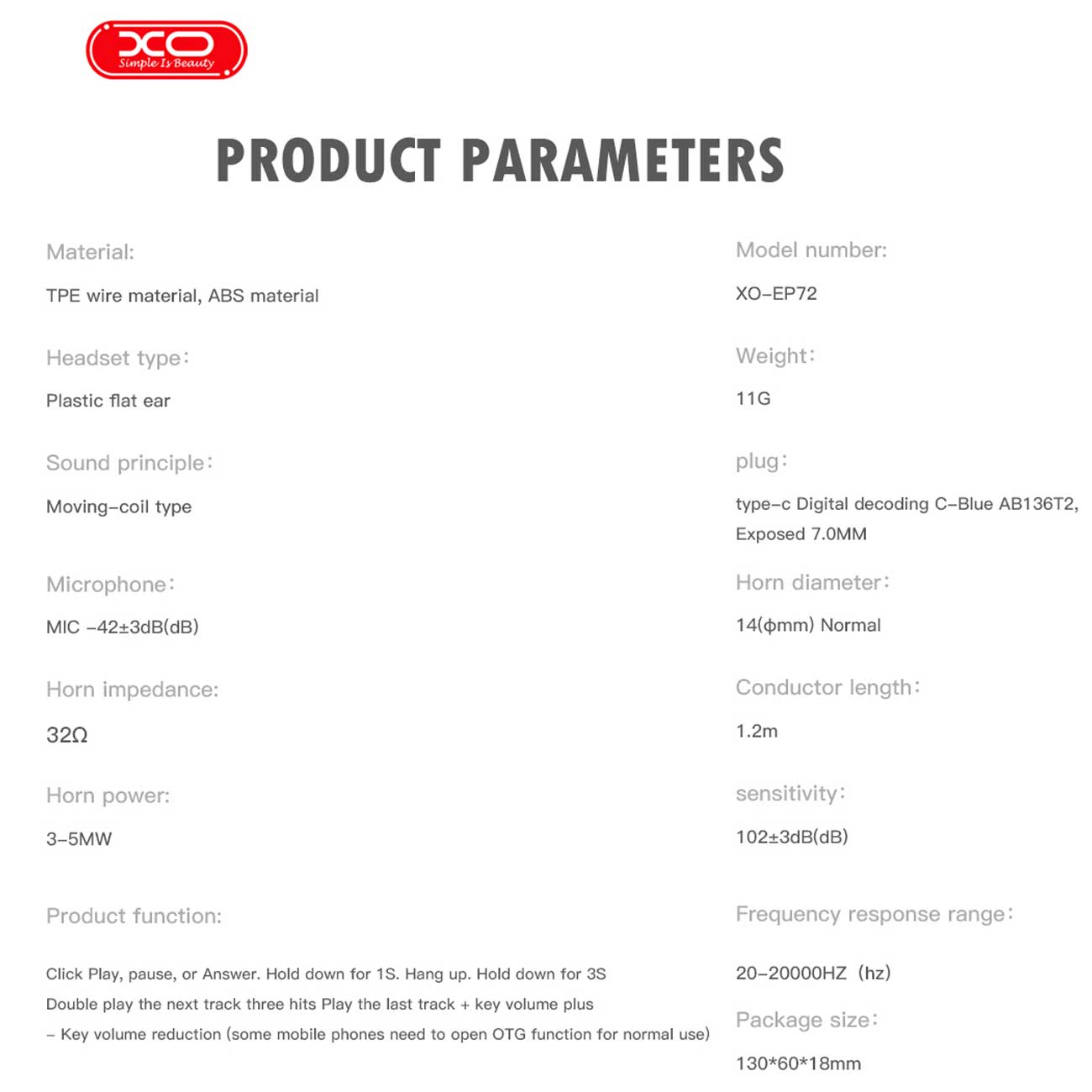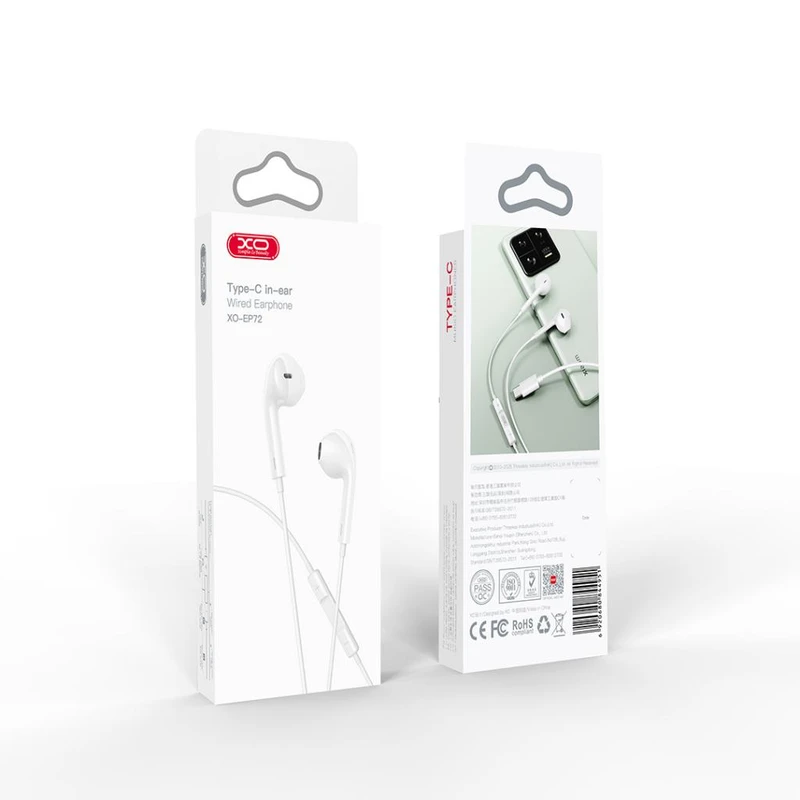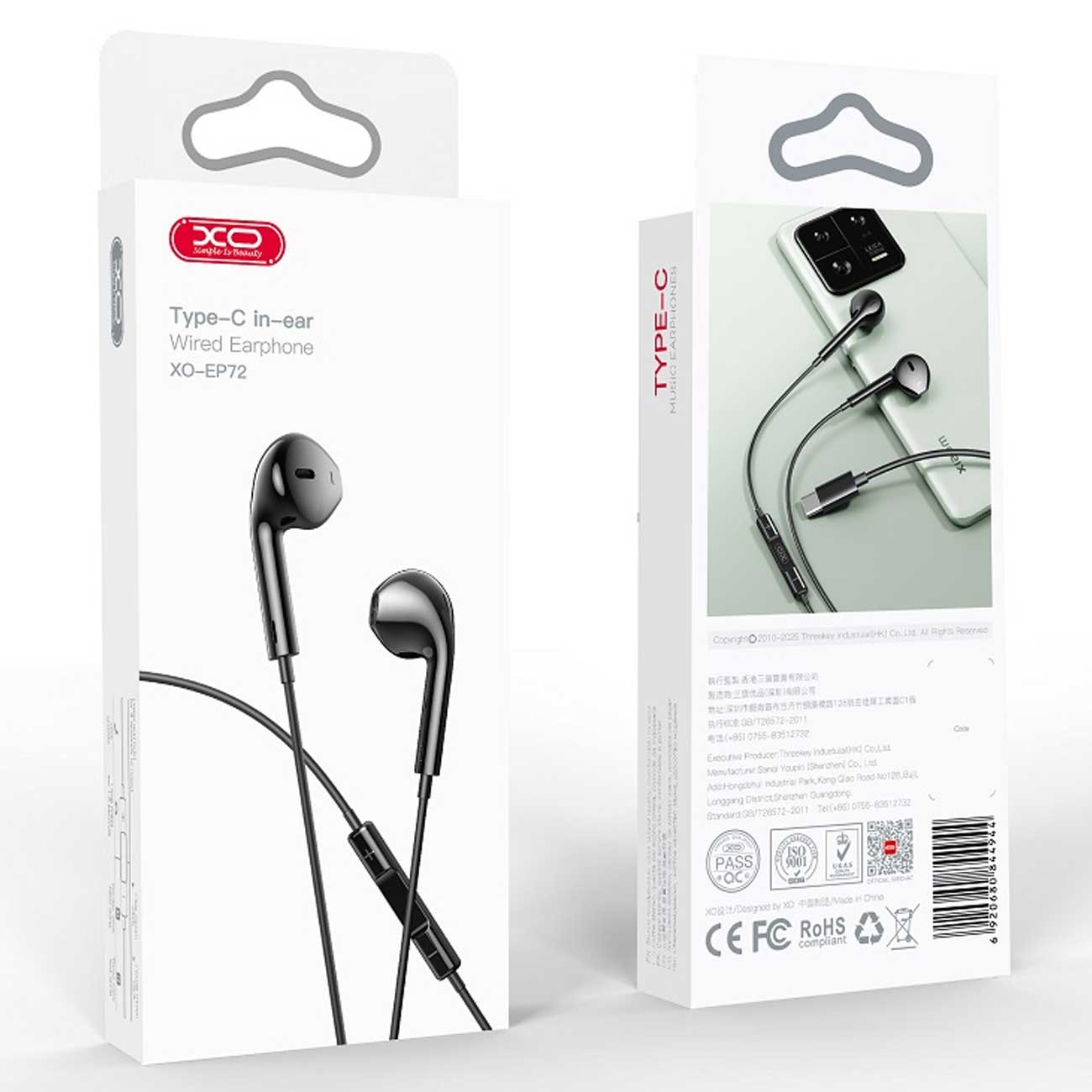 هندزفری تایپ سی ایکس او EP72 با رابط USB-C، درایور 14 میلیمتری، امپدانس 32 اهم، حساسیت 102dB، کابل 1.2 متری TPE، میکروفون و دکمه کنترل؛ مناسب موسیقی، بازی و مکالمه روزمره.