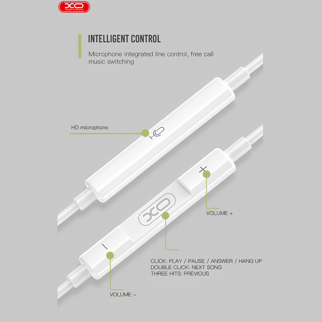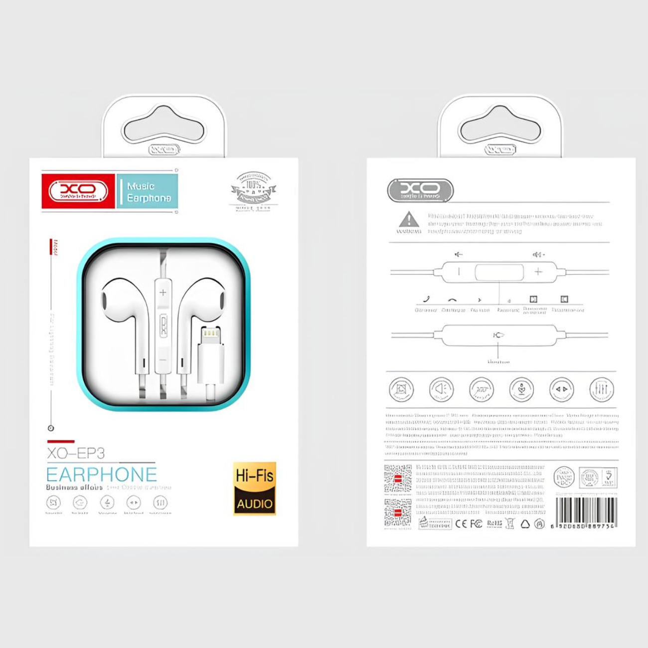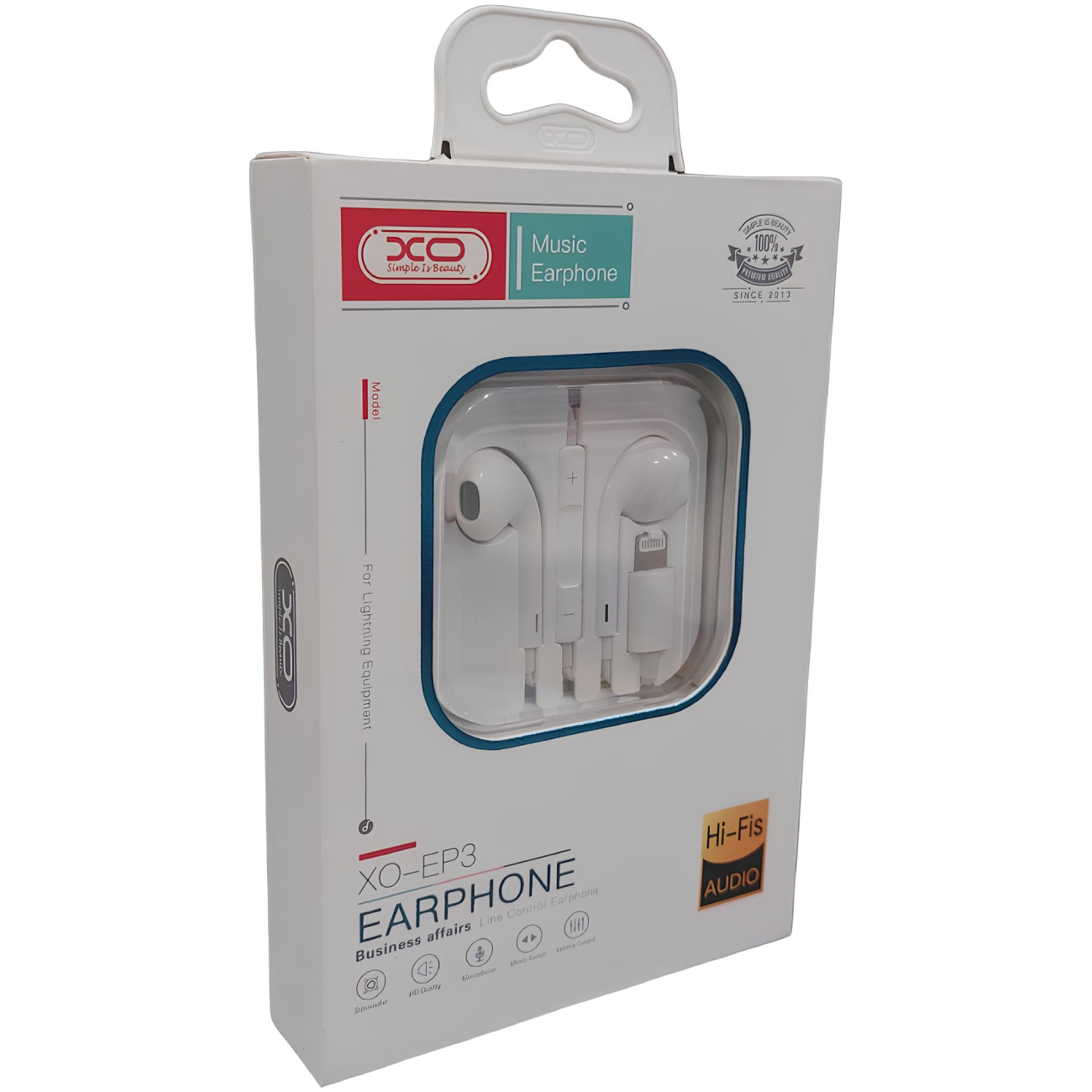 هندزفری سیمی XO EP3 با رابط لایتنینگ (Lightning)، درایور 14 میلیمتری، امپدانس 32 Ω، حساسیت حدود 100 dB، کابل 1.2 متر، میکروفون داخلی و کلید کنترل؛ مناسب آیفون و تبلتهای اپل.
