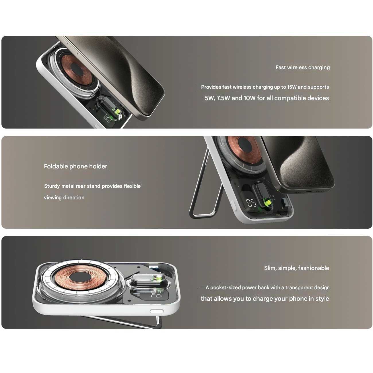 این مدل با ظرفیت ۵۰۰۰ میلیآمپرساعت مناسب ۱ بار شارژ کامل گوشیهای معمولی و نیم تا یک بار شارژ گوشیهای پرچمدار است؛ اما مزیت بزرگش این است که با وجود سایز کوچک، هم وایرلس 15 وات دارد و هم Type-C سریع 20 وات.