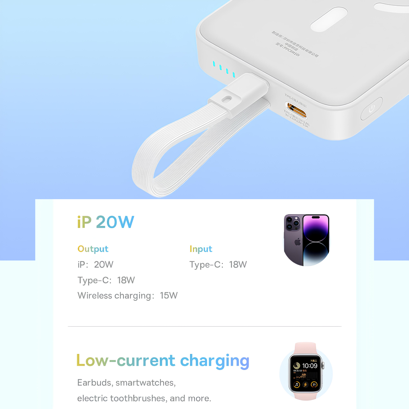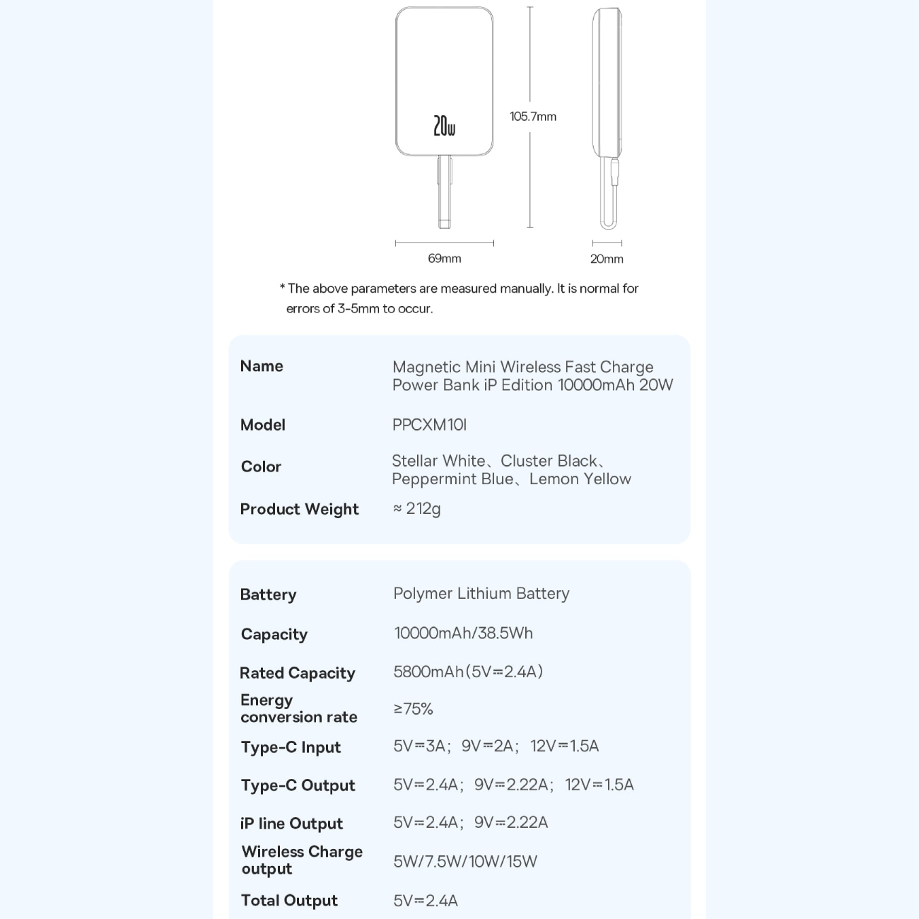 | توان خروجی | USB-C: 5V/2.4A; 9V/2.22A; 12V/1.5A Lightning Cable Output: 5V/2.4A; 9V/2.22A Wireless Charging Output: 5W/7.5W/10W/15W |