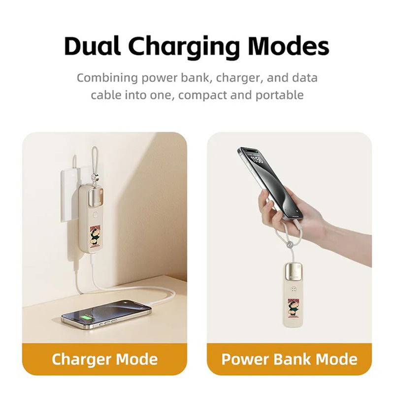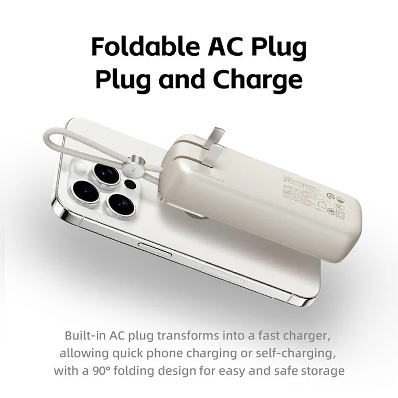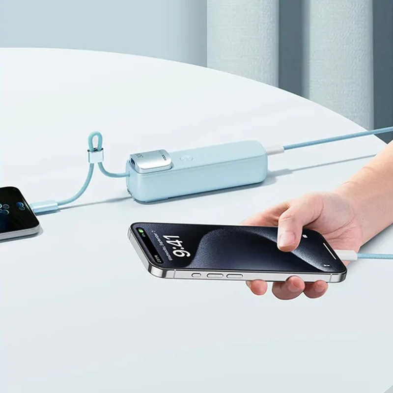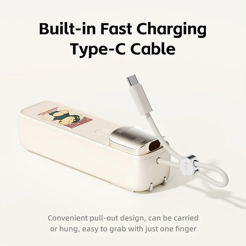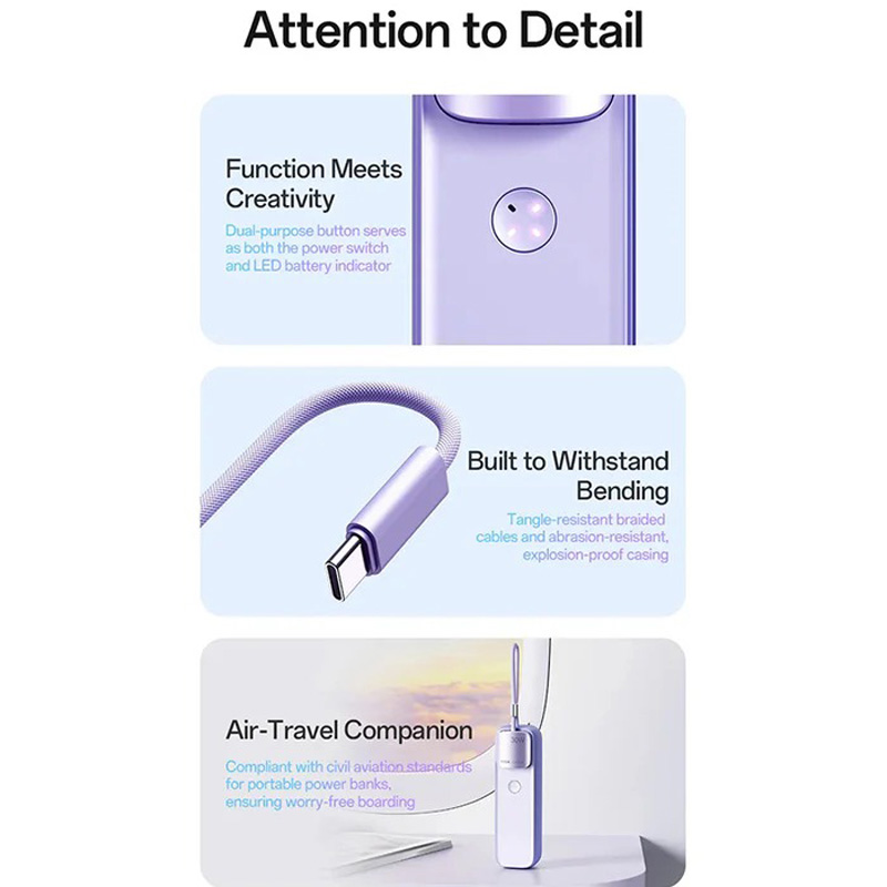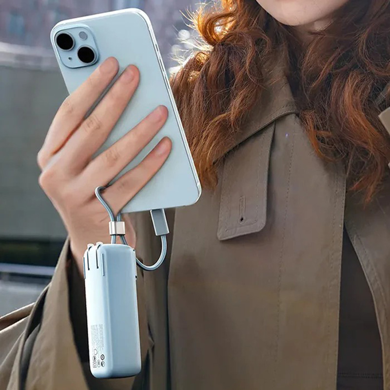 مهمترین ویژگی این پاوربانک داشتن کابل Type-C متصل است؛ یعنی بدون نیاز به حمل کابل اضافه، همیشه آماده استفاده است و یک انتخاب عالی برای داخل کیف کوچک، جیب یا استفاده سریع در مسیر محسوب میشود.