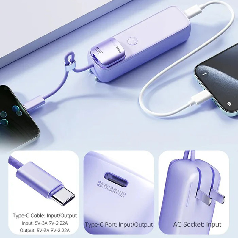 پاوربانک تایپ سی 30 وات 5000 به همراه کابل تایپ سی راک RWC-8890