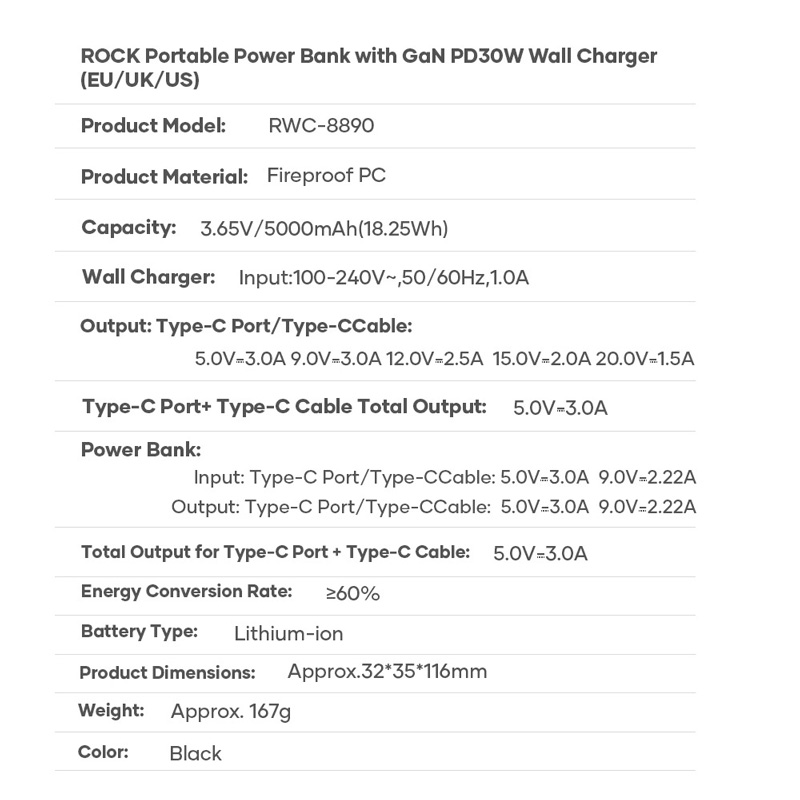 | توان خروجی | Wall Charger: Type-C Port/Type-CCable:5.0V≈3.0A 9.0V≈3.0A 12.0V≈2.5A 15.0V≈2.0A 20.0V≈1.5APower Bank:Type-C Port+ Type-C Cable Total Output: 5.0V≈3.0AType-C Port/Type-CCable: 5.0V≈3.0A 9.0V≈2.22ATotal Output for Type-C Port + Type-C Cable: 5.0V≈3.0A |